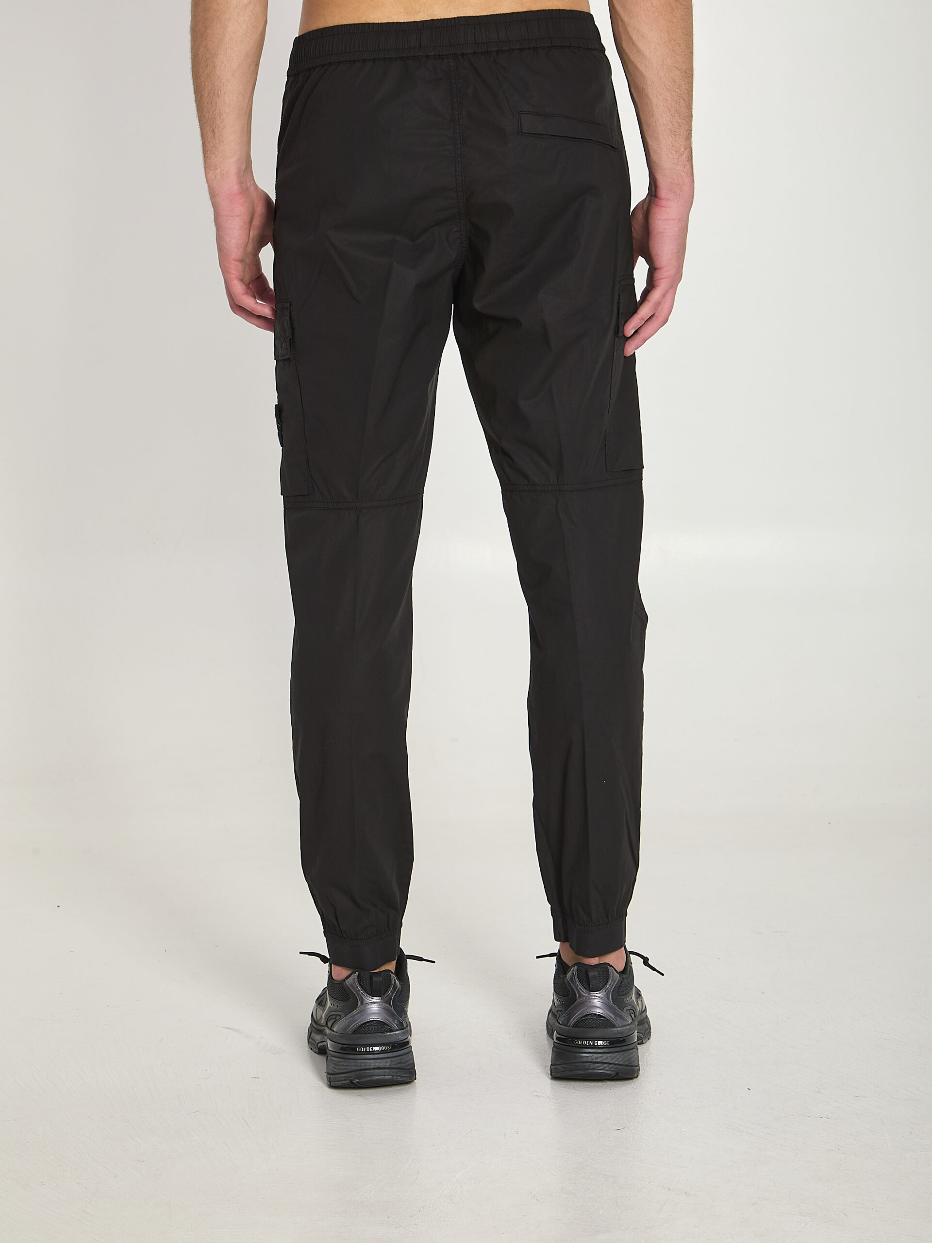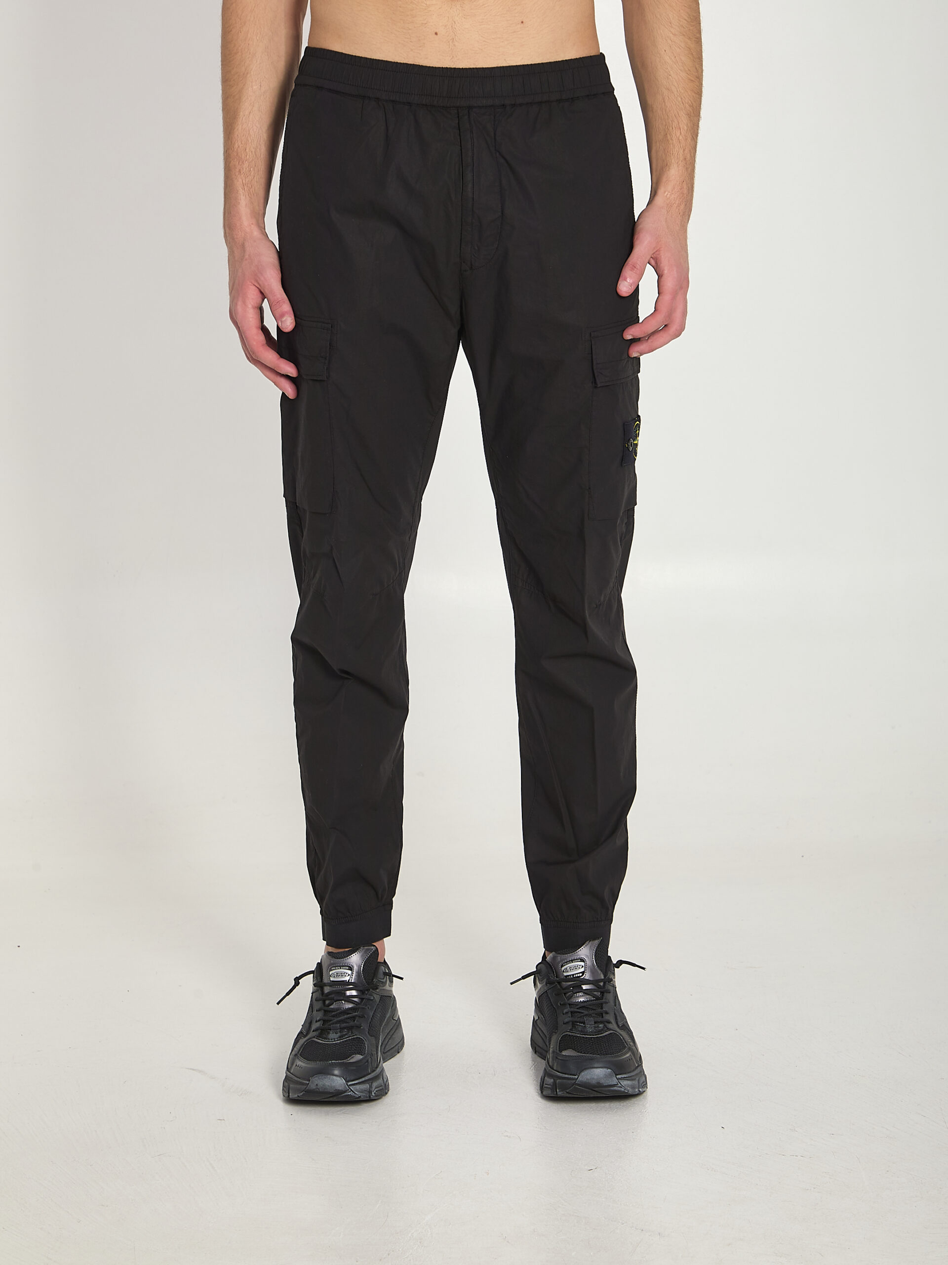 Lightweight stretch cotton black pants. Featuring an elastic waistband with internal drawstring, front zip closure, two front welt pockets, two side cargo pockets with flaps and buttons, iconic badge, a welt pocket with button at the back, and elasticized hem. Regular fit.