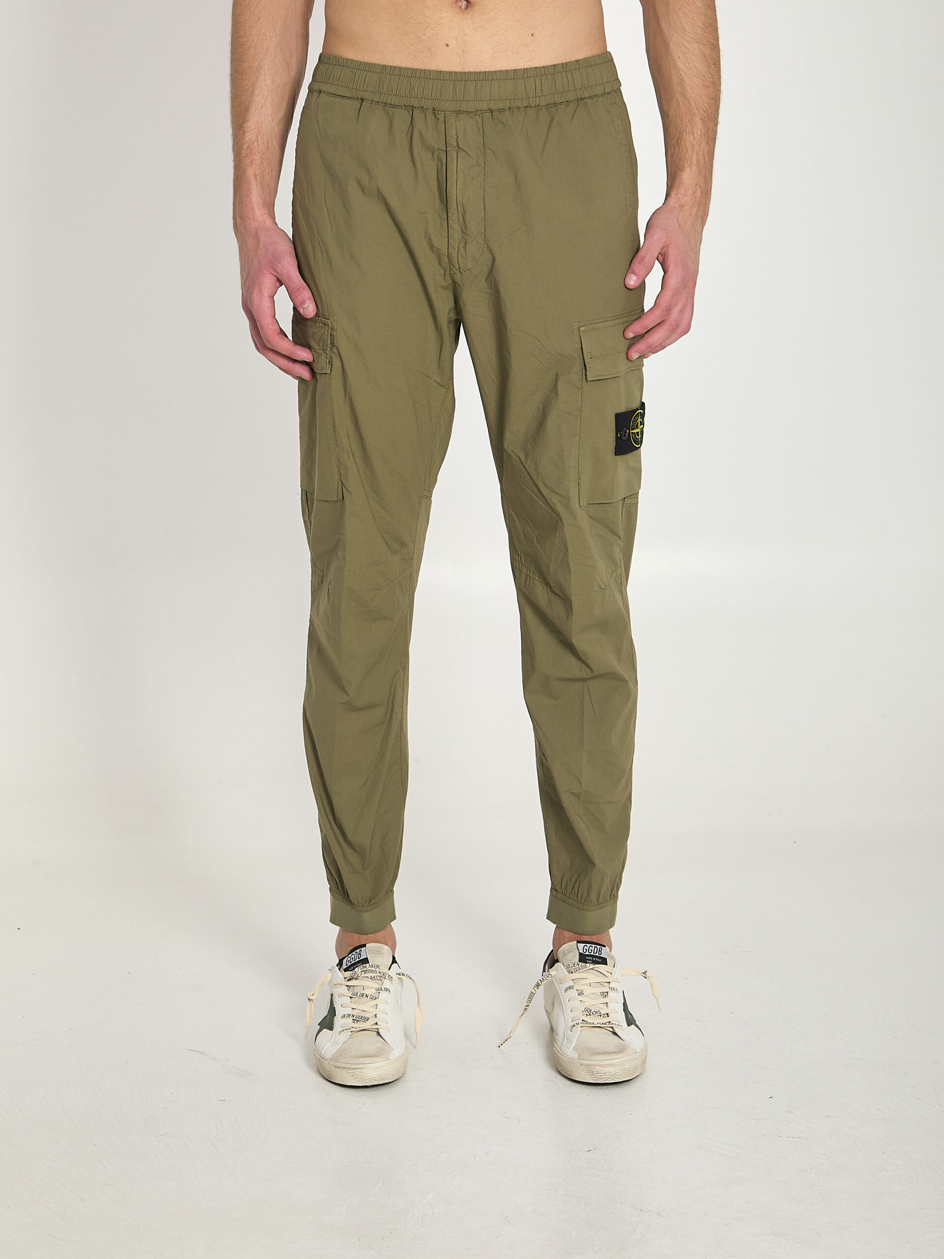 Lightweight stretch cotton military green pants. Featuring an elastic waistband with internal drawstring, front zip closure, two front welt pockets, two side cargo pockets with flaps and buttons, iconic badge, a welt pocket with button at the back, and elasticized hem. Regular fit.
