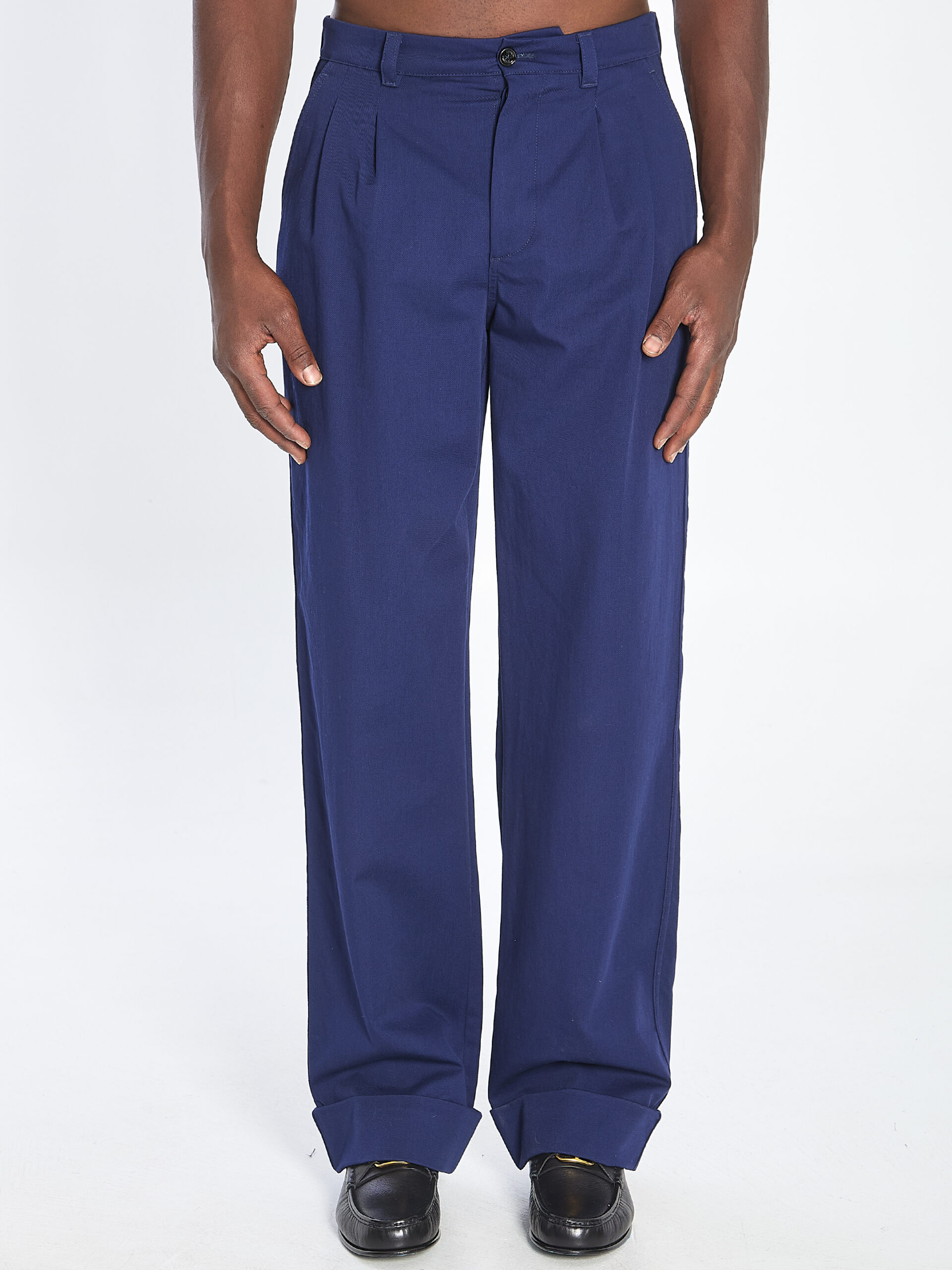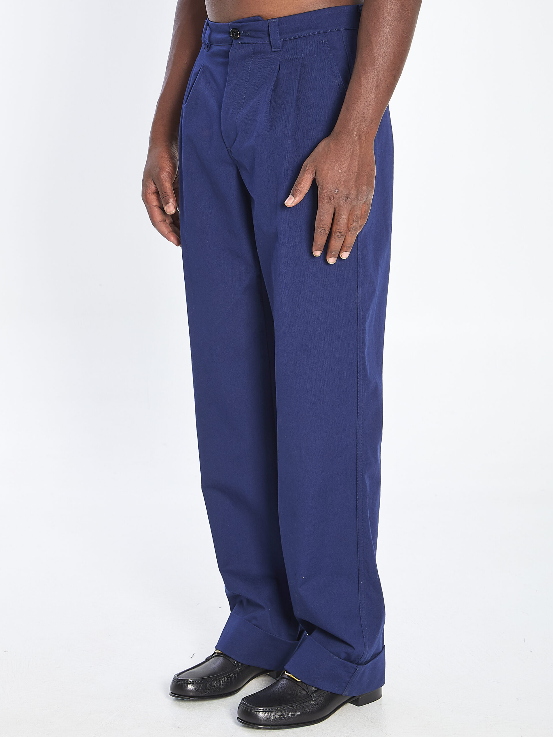 Trousers in Bluette blue cotton gabardine. Features belt loops, front button closure, pleats at the waist, two side pockets, V-shaped detail at the back waistband, two front welt pockets with button, applied VLogo Signature on the back, and turned-up hems. Regular fit.