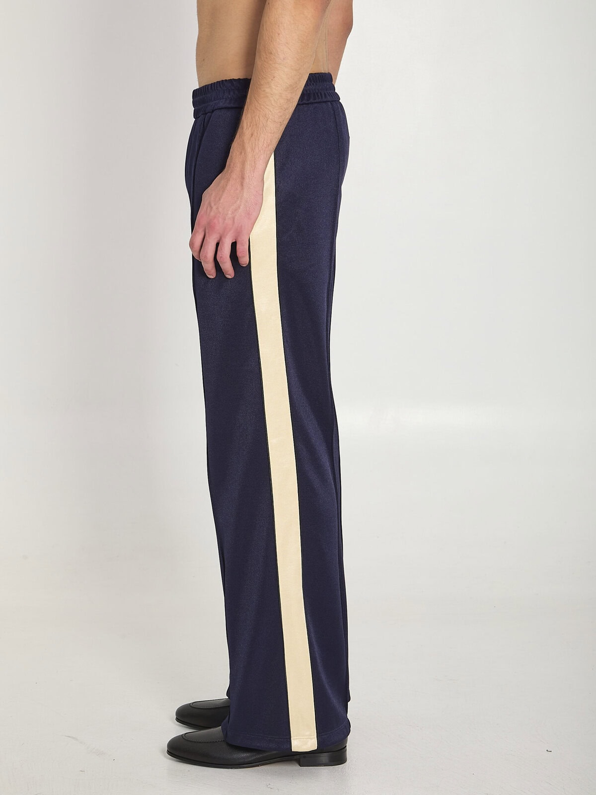 Navy blue polyester and cotton sport pants with butter yellow side stripes. They feature an elastic waist with an internal drawstring, two side pockets, a back patch pocket with a metal logo, sewn pleats at the front and back, a mid-rise waist, and a wide leg. Regular fit.