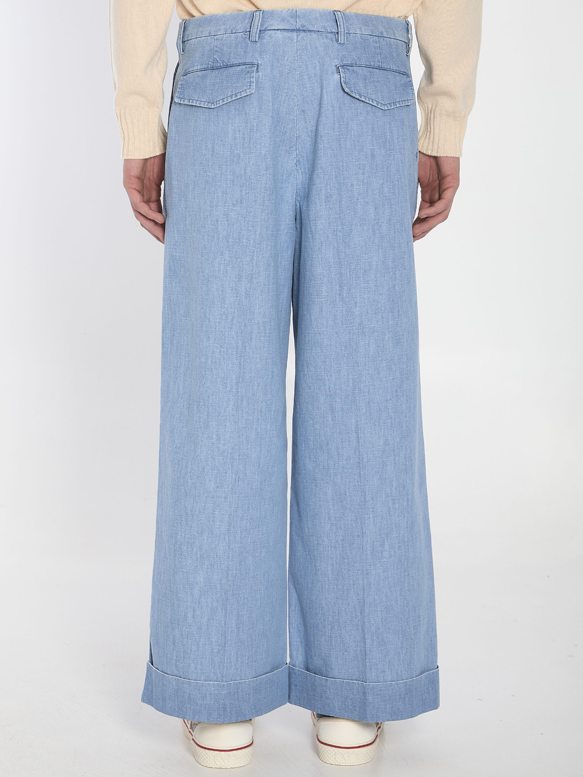 Light blue lightweight cotton trousers. They feature a hook-and-button closure with a zip, two side pockets with gold button closures featuring the VLogo Signature, belt loops, two back flap pockets, wide legs, and cuffed hems. Oversized fit.