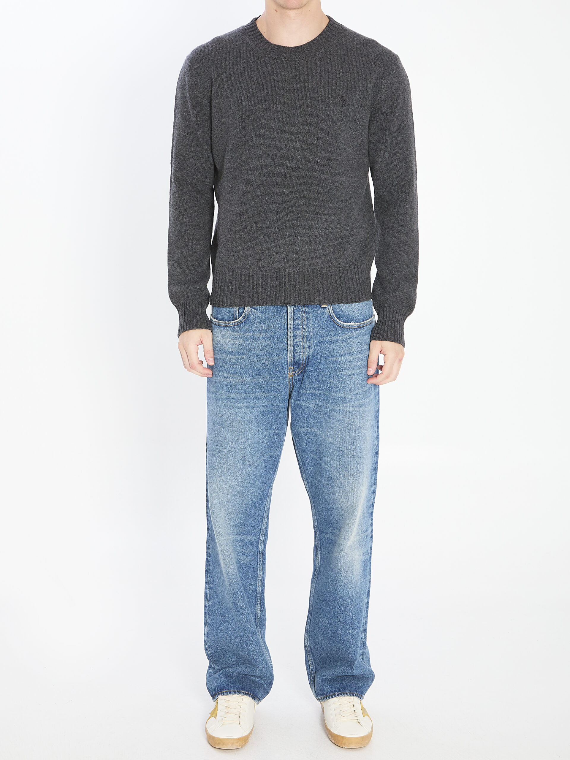 Sweater in anthracite grey cashmere-wool blend. Features a ribbed crew neck, long sleeves, black embroidered Ami de Coeur on the chest, and ribbed hem and cuffs. Regular fit.