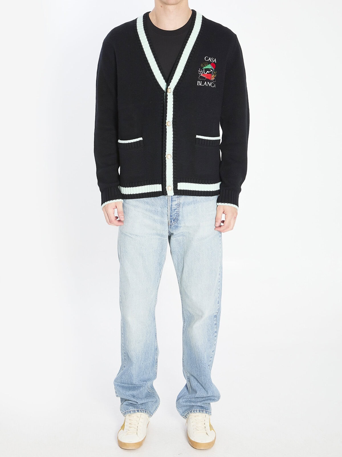 Black Merino wool cardigan. Featuring a V-neckline with contrast trims, pearl buttons, embroidery on the chest and back, two front patch pockets, and ribbed finishes. Regular fit.