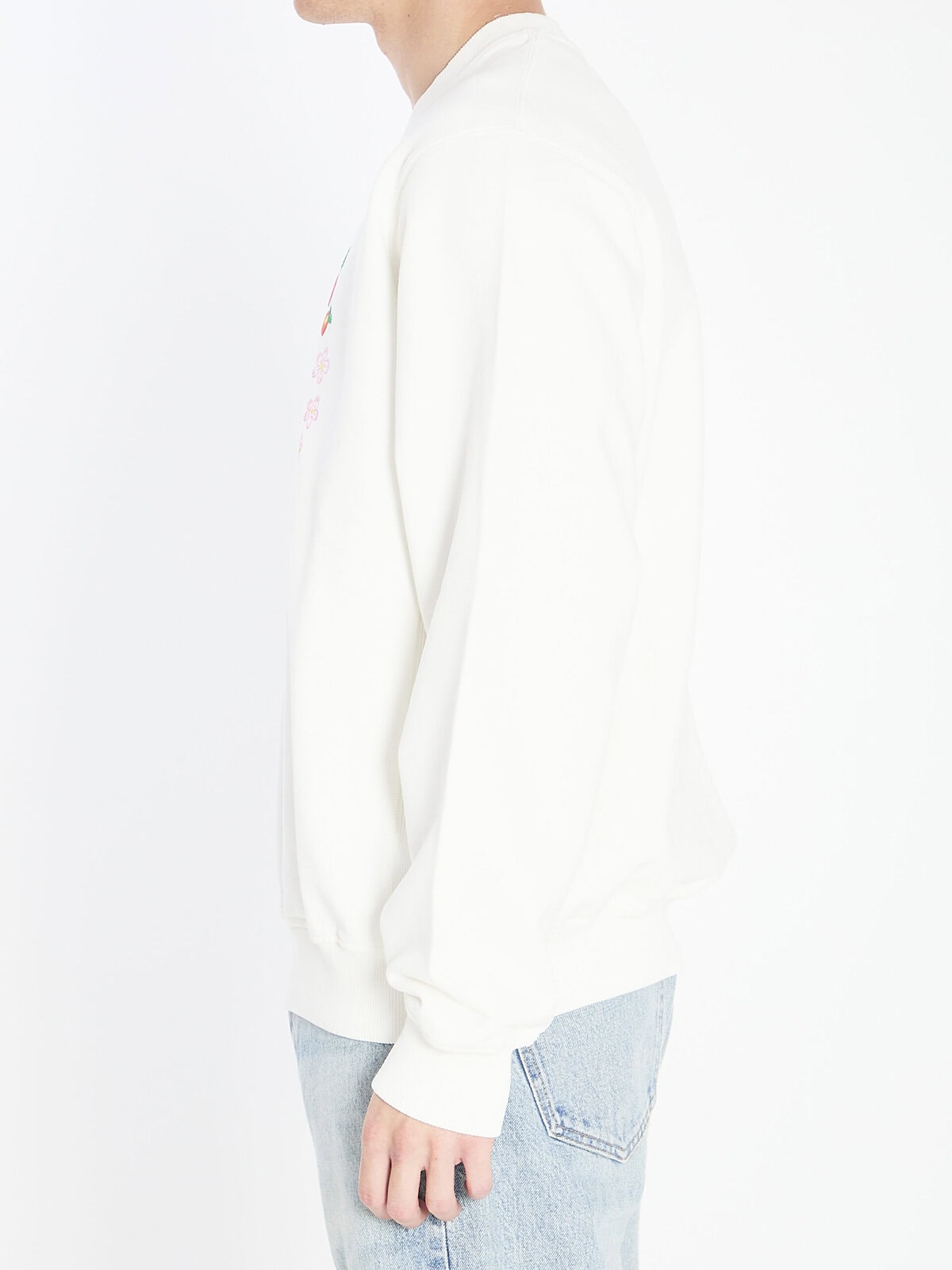 Ivory white organic cotton sweatshirt. Featuring a crew neck, long sleeves, embroidered Casa Way Mountain design on the front, ribbed side panels, and ribbed finishes. Relaxed fit.