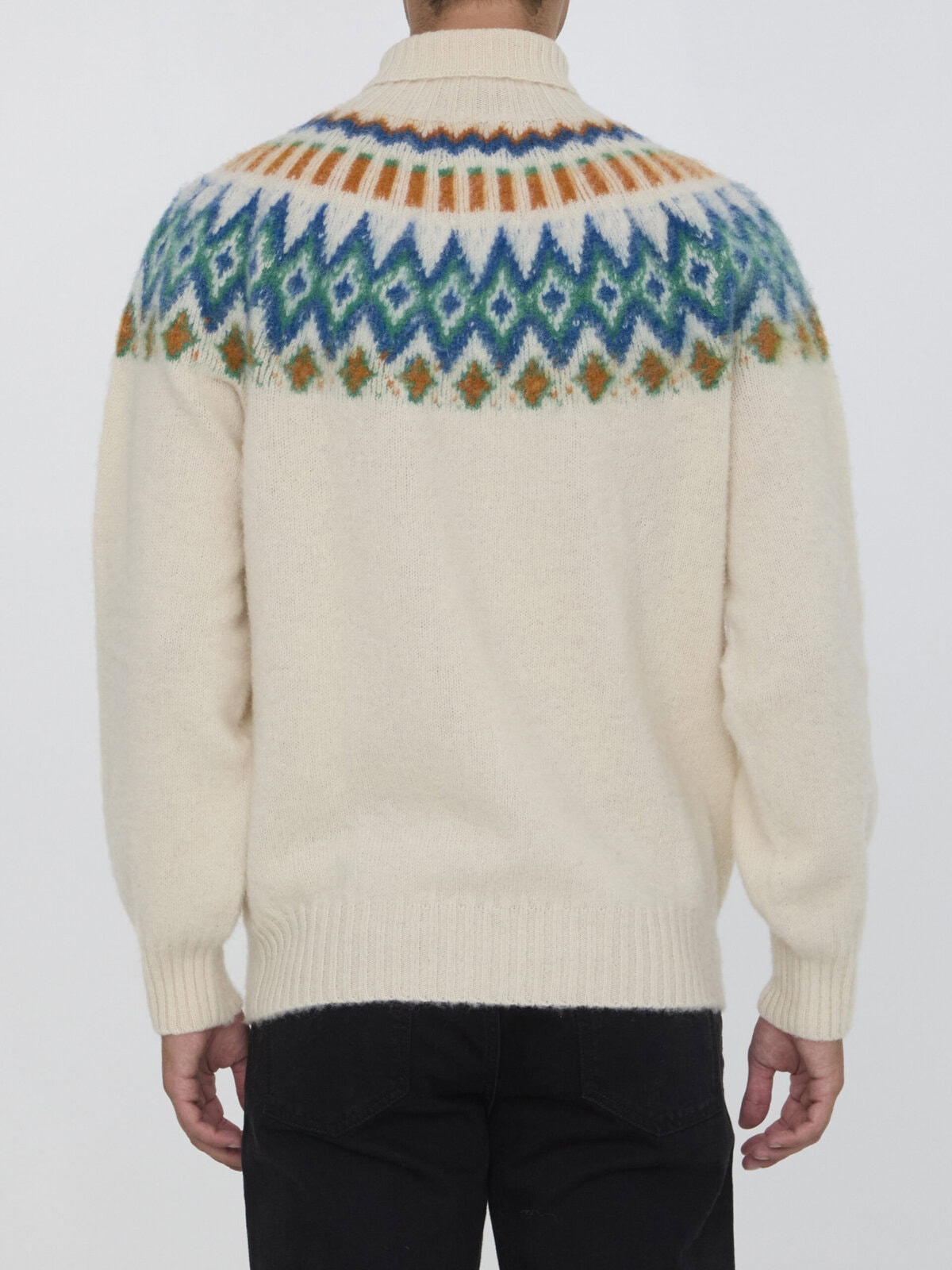 Love On The Rocks high-neck sweater in ecru pure wool with multicolor pattern. Ribbed trims. Regular fit.