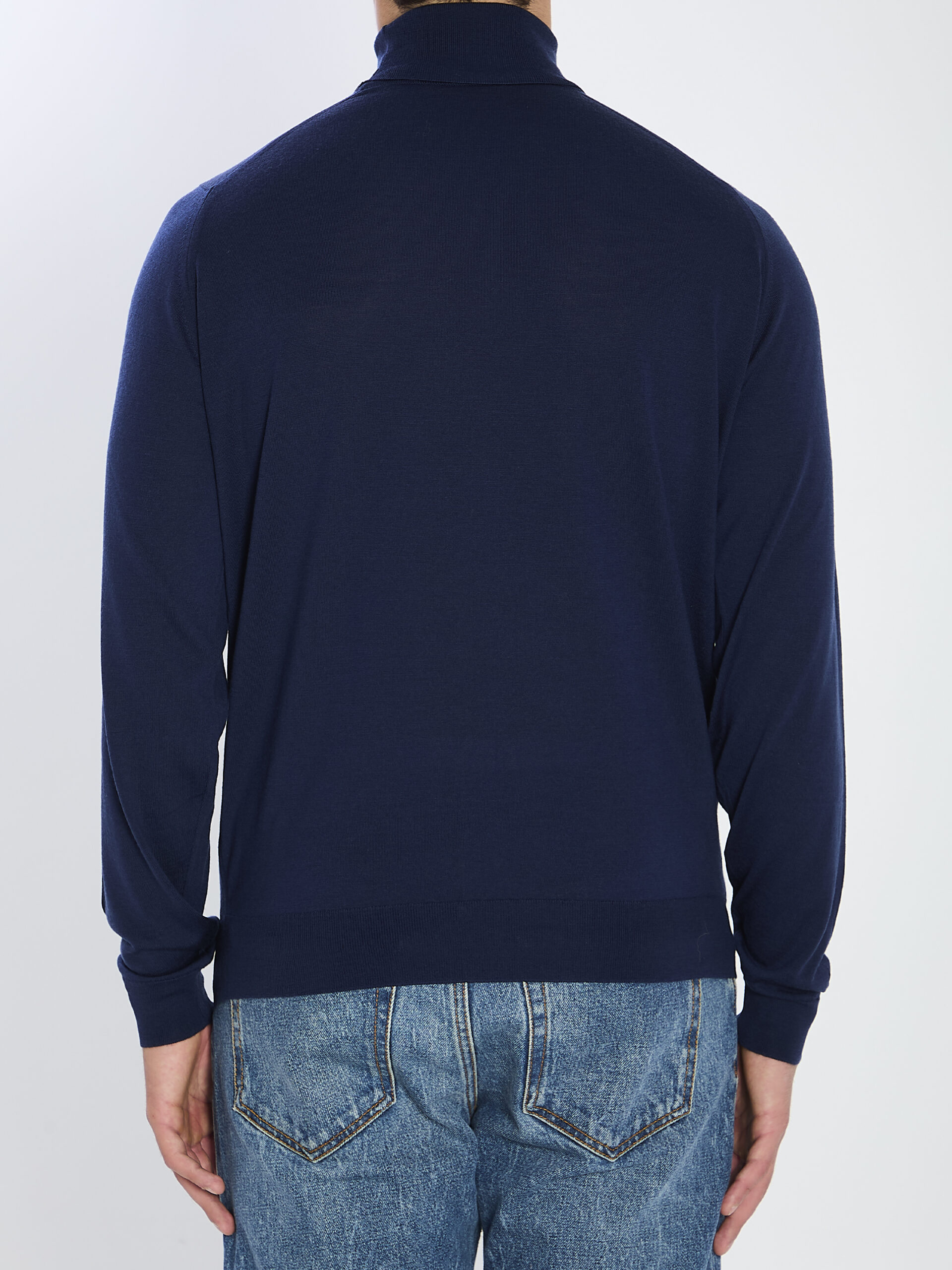 Hemingway blue merino wool turtleneck sweater. Ribbed collar, cuffs, and hem. Regular fit.