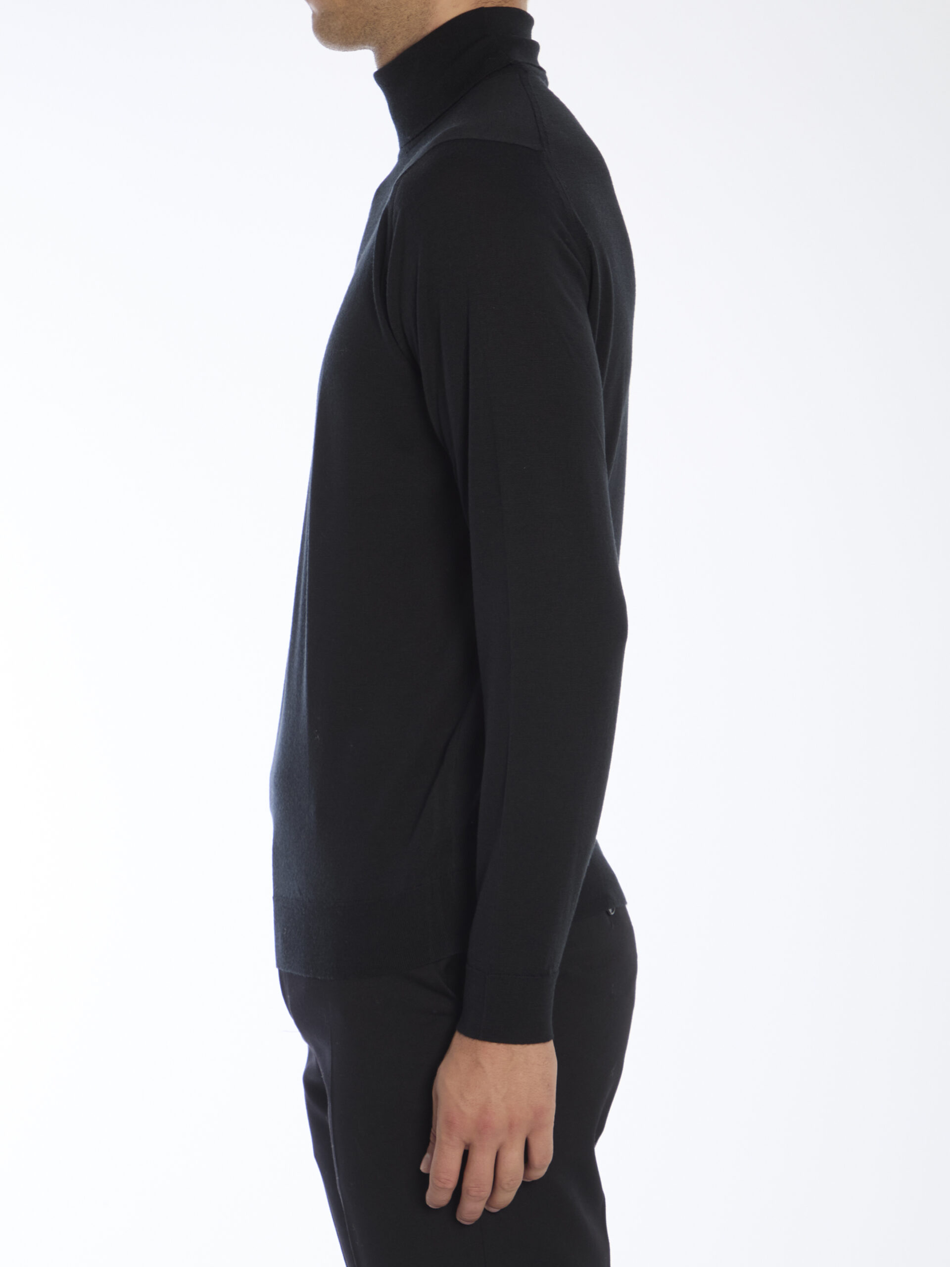 Black merino wool turtleneck sweater. Ribbed collar, cuffs, and hem. Regular fit.