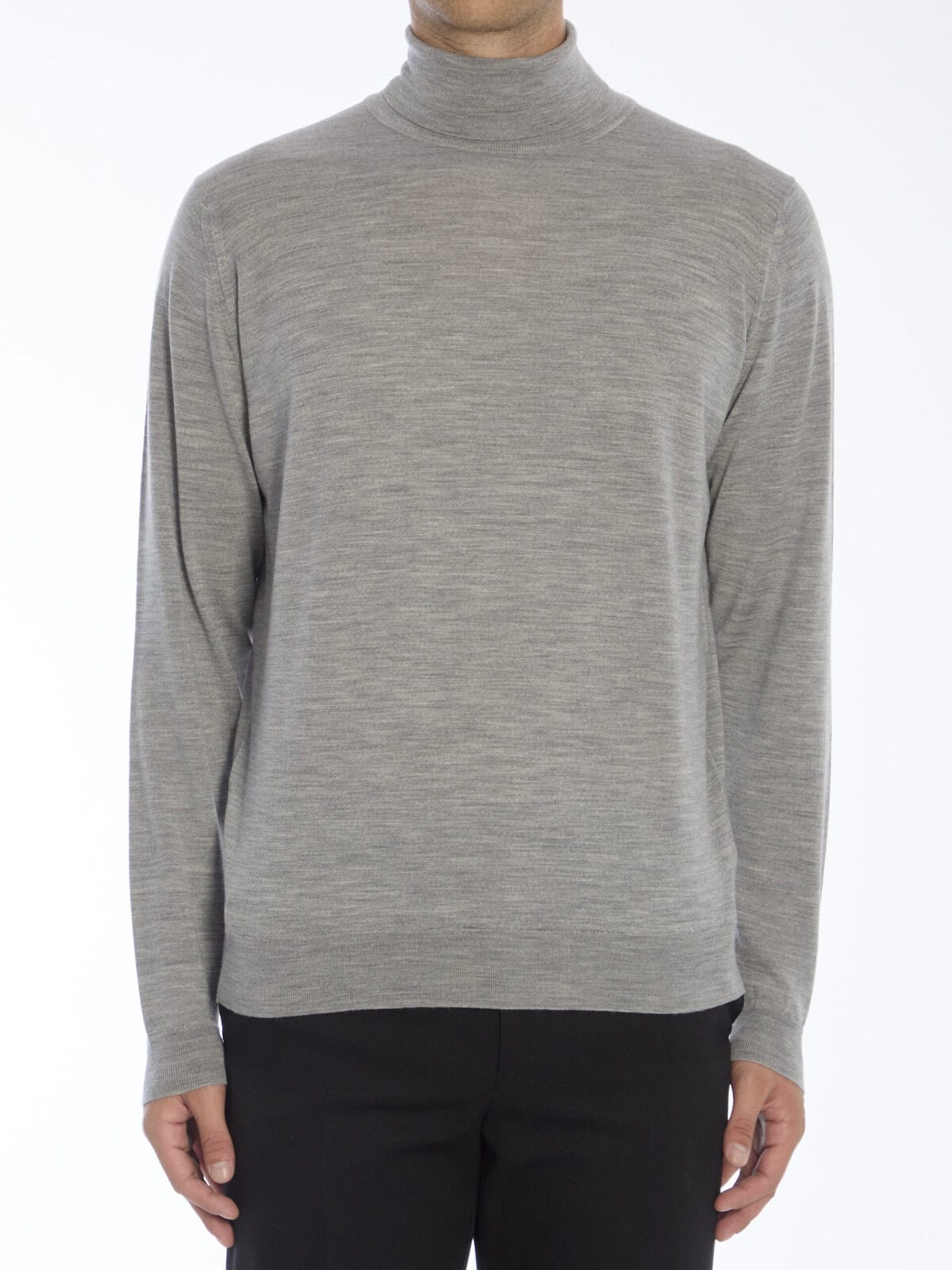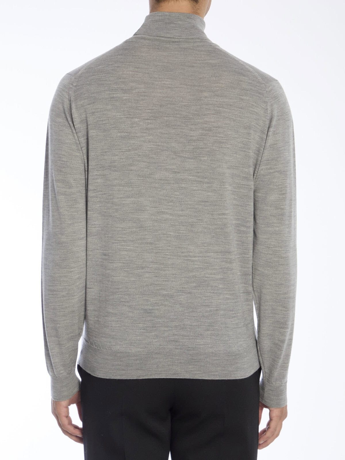 Gray merino wool turtleneck sweater. Ribbed collar, cuffs, and hem. Regular fit.
