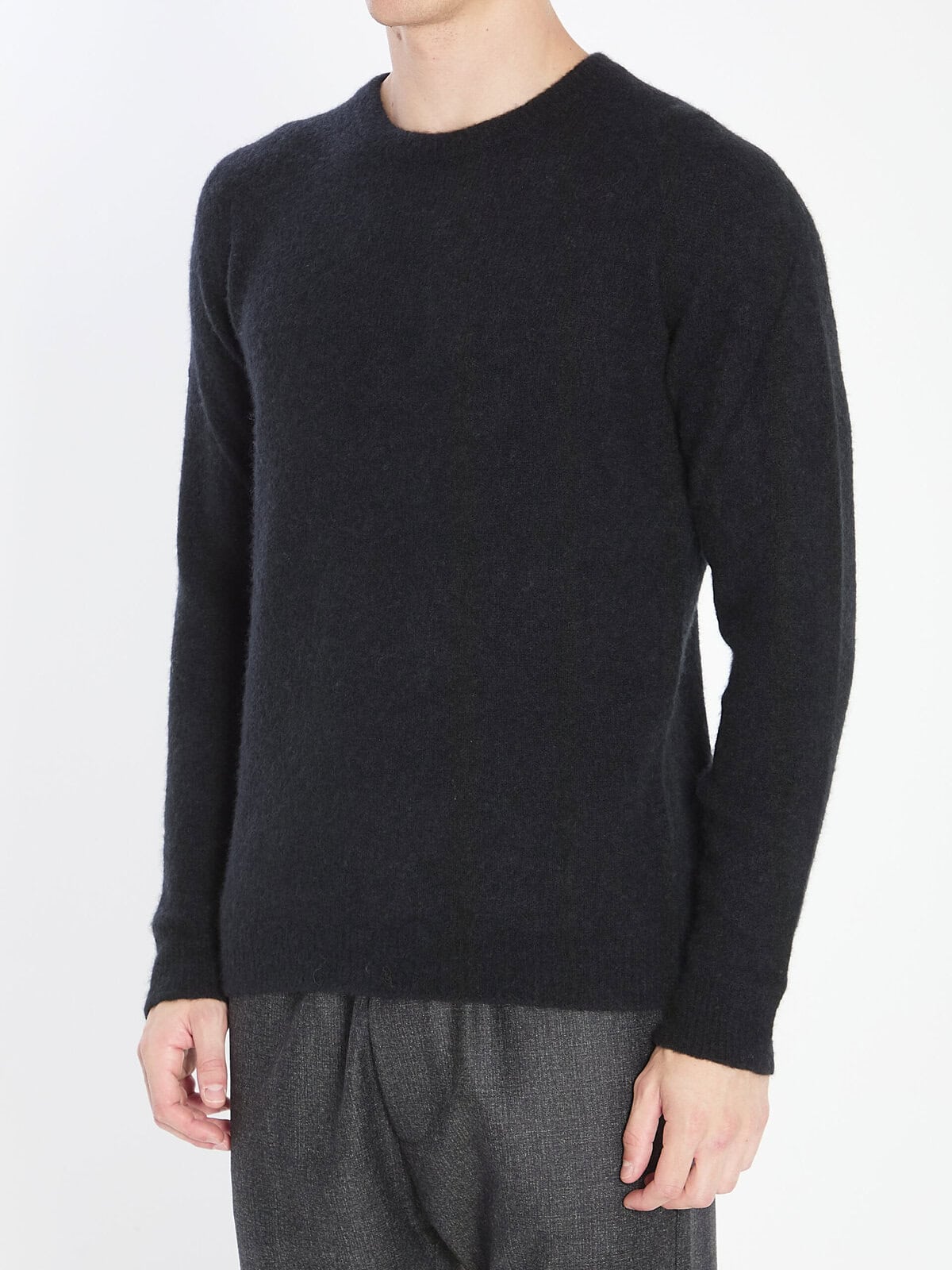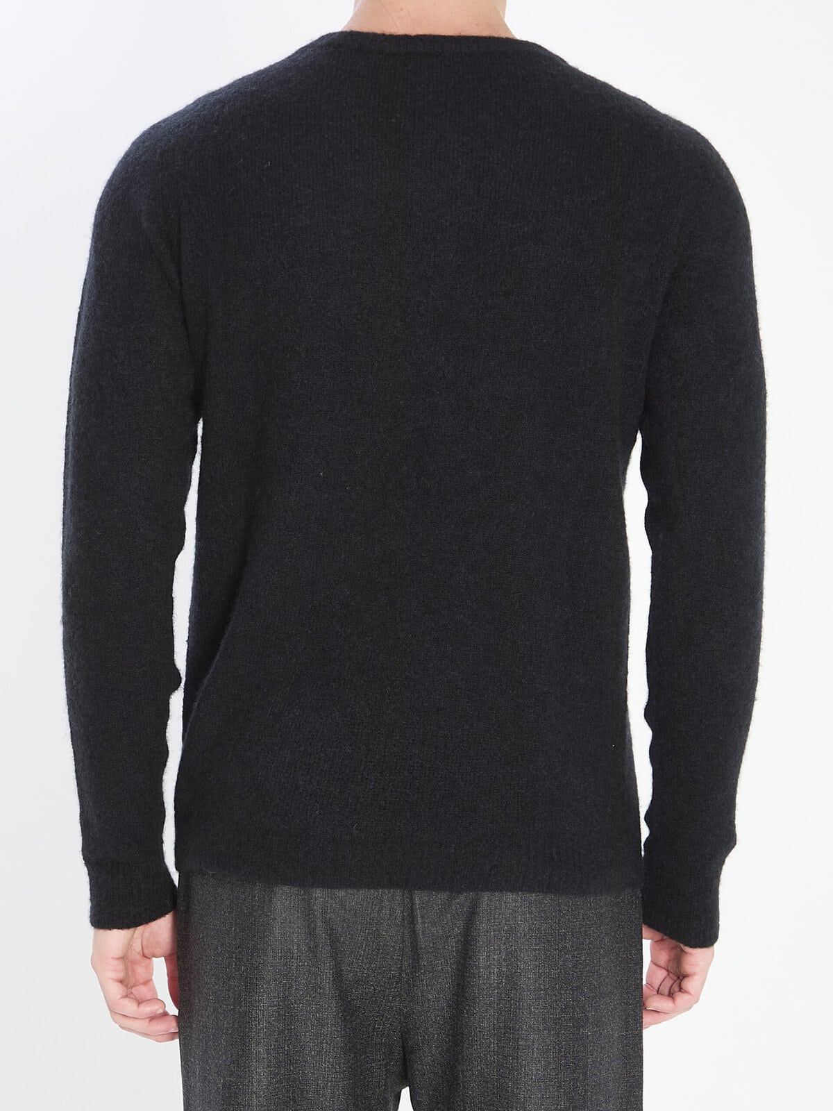 Sweater in cashmere, silk, and polyester in black. Features a crew neck, long sleeves, and ribbed finish. Comfortable fit.