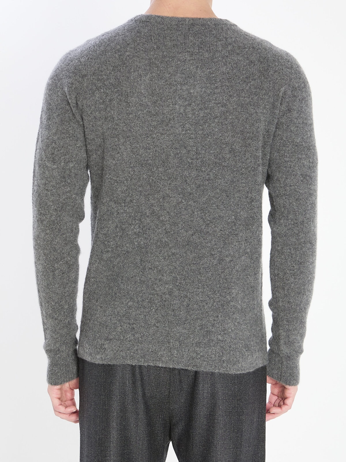 Sweater in cashmere, silk, and polyester in anthracite grey. Features a crew neck, long sleeves, and ribbed finish. Comfortable fit.
