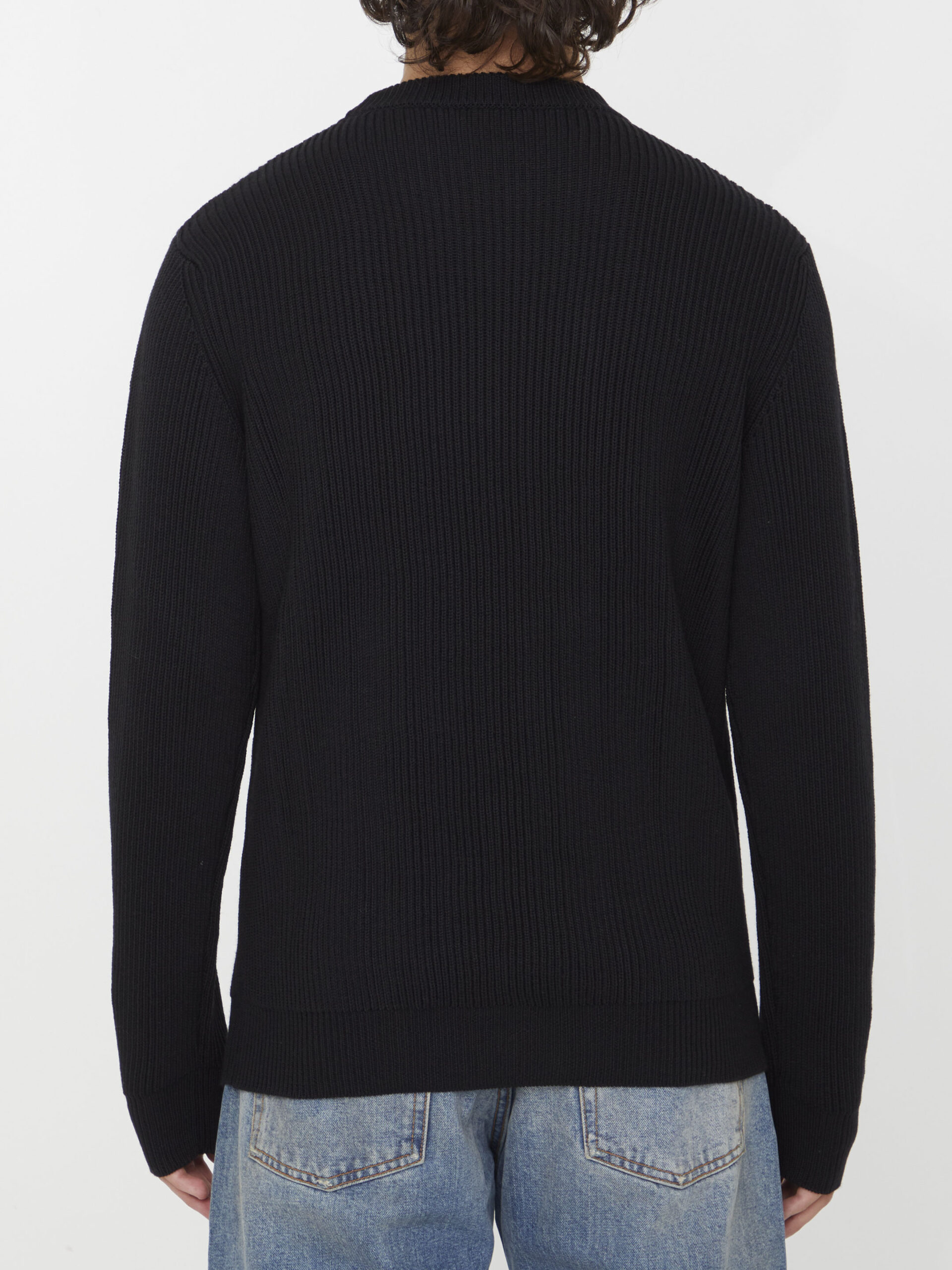 Long-sleeved crewneck jumper in black ribbed merino wool. Regular fit.
