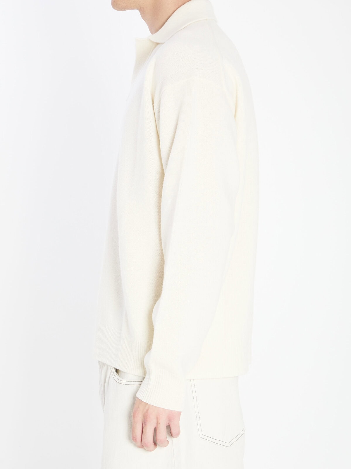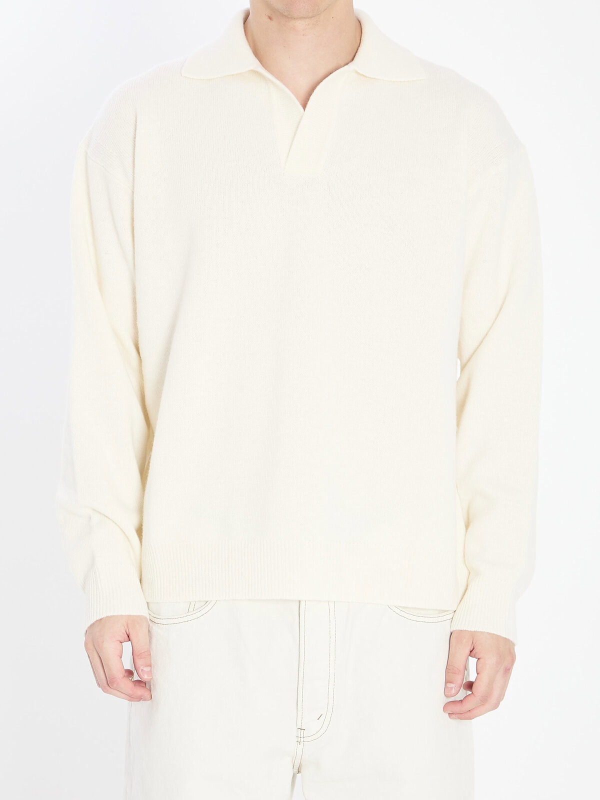 Polo in extra-fine Merino wool and cashmere in white. Features a V-neck, long sleeves, and ribbed finish. Loose fit.