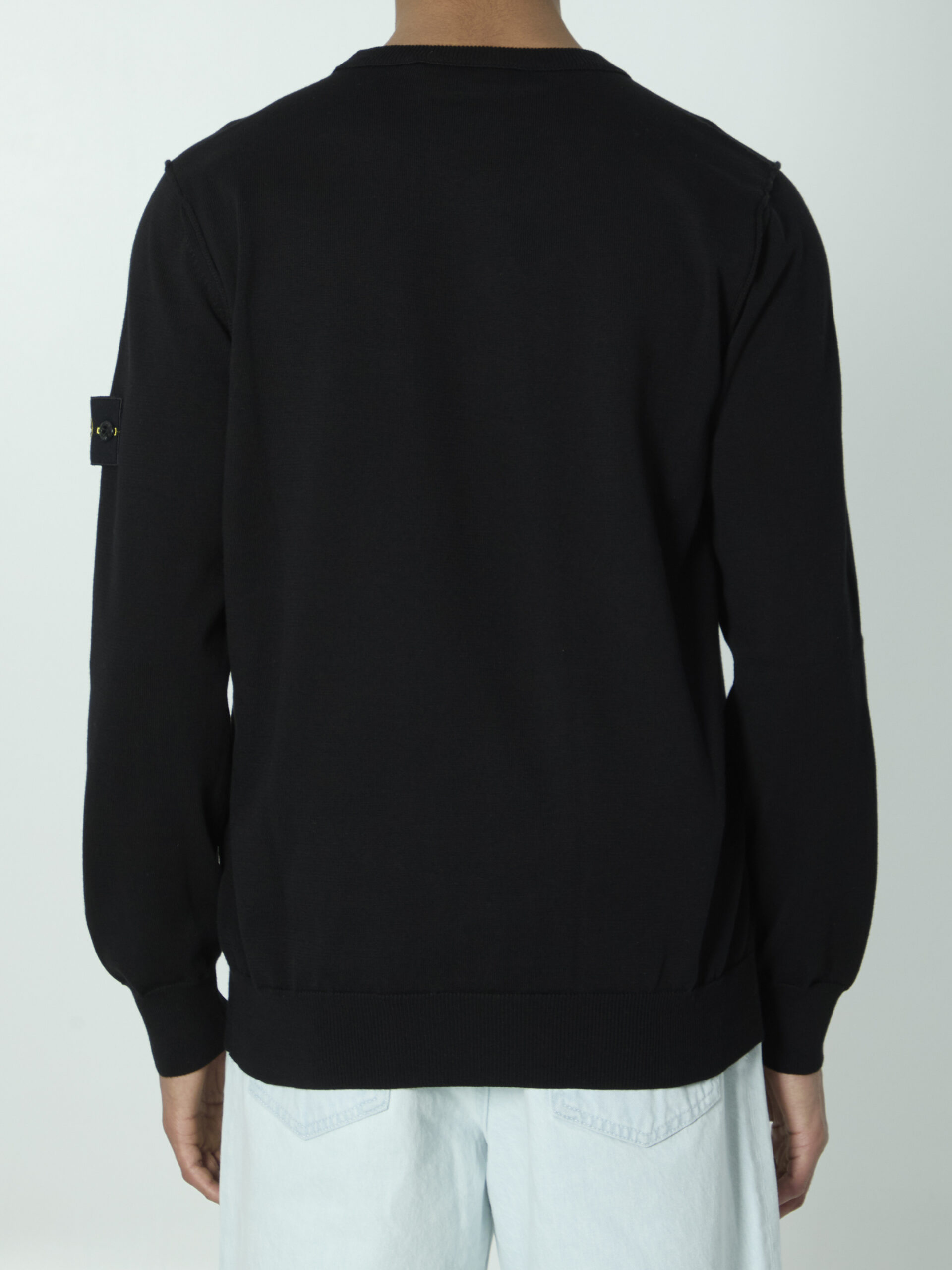 Black organic cotton sweater. Features a ribbed crew neck, rolled edge stitching on the armholes, long sleeves, ribbed cuffs and hem, iconic badge applied on the sleeve. Regular fit.