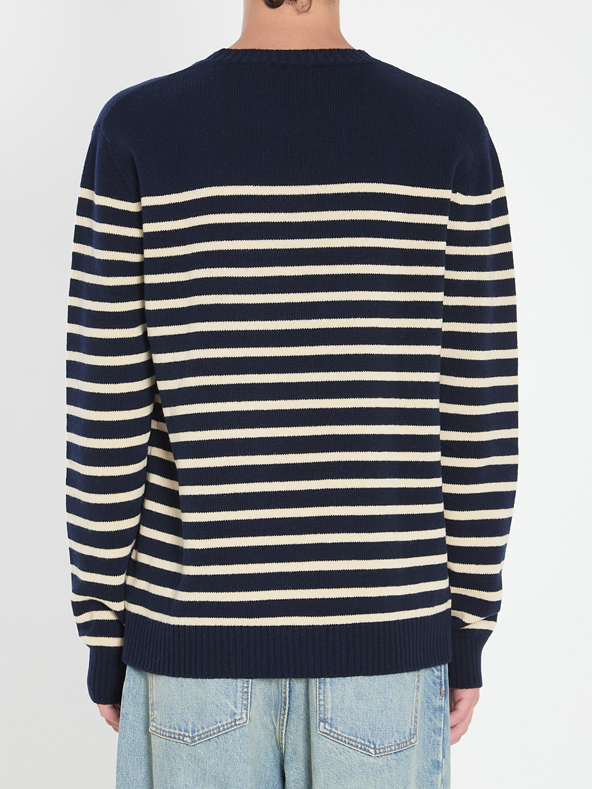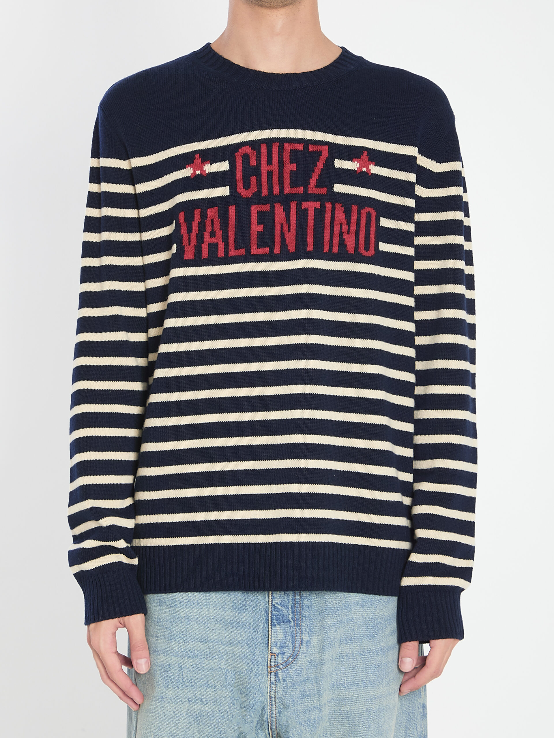 Sweater in blue and butter-colored wool. Features a regular fit, red jacquard Chez Valentino motif on the chest, crew neck, and ribbed cuffs and hem.