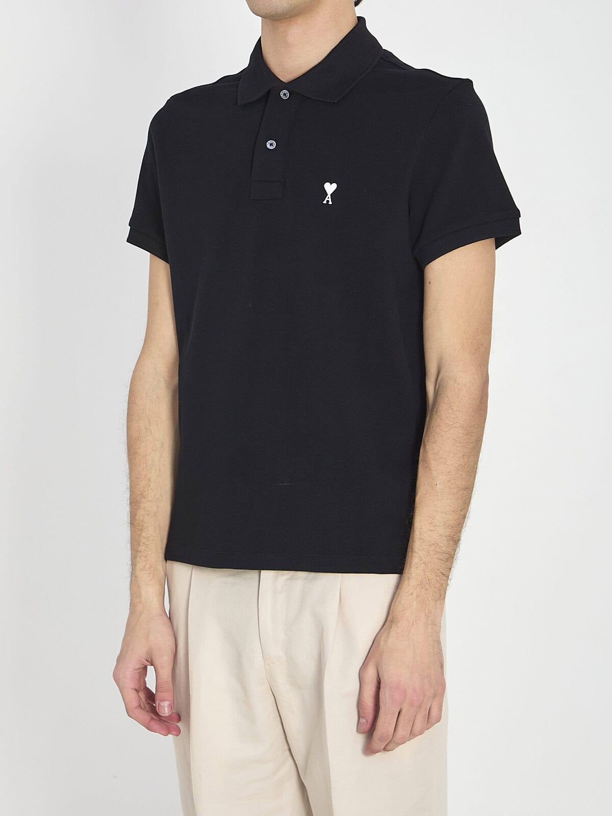 Polo shirt in black cotton piqué. It features a pointed collar, a two-button polo placket, short sleeves, a white Ami de Coeur embroidery on the chest, a tone-on-tone AMI embroidery at the base of the neck on the back, and two side vents on the hem. Regular fit.