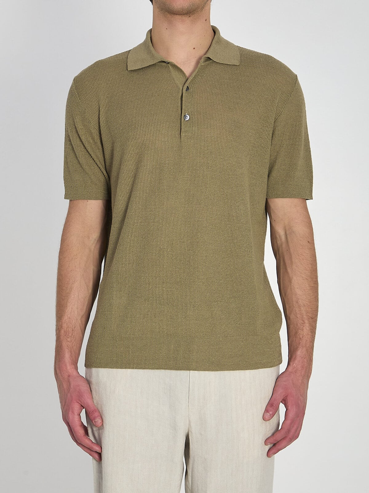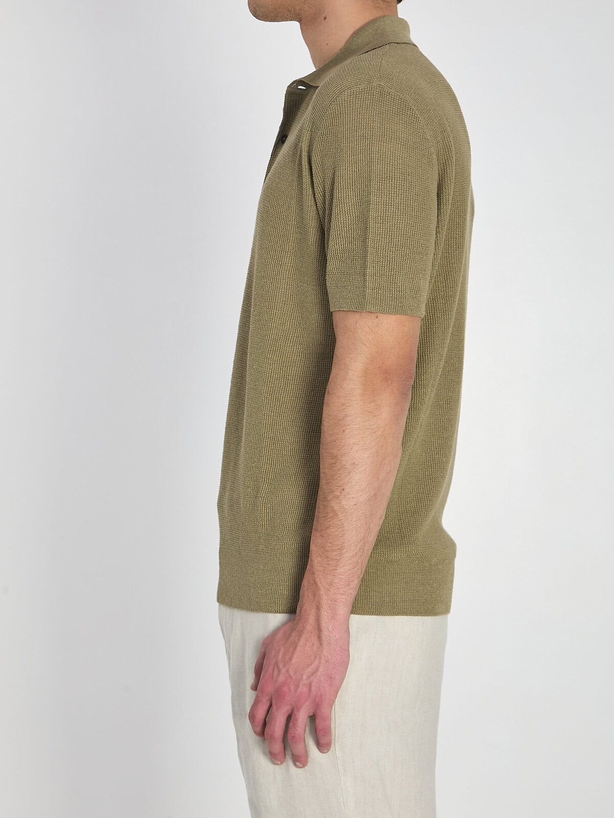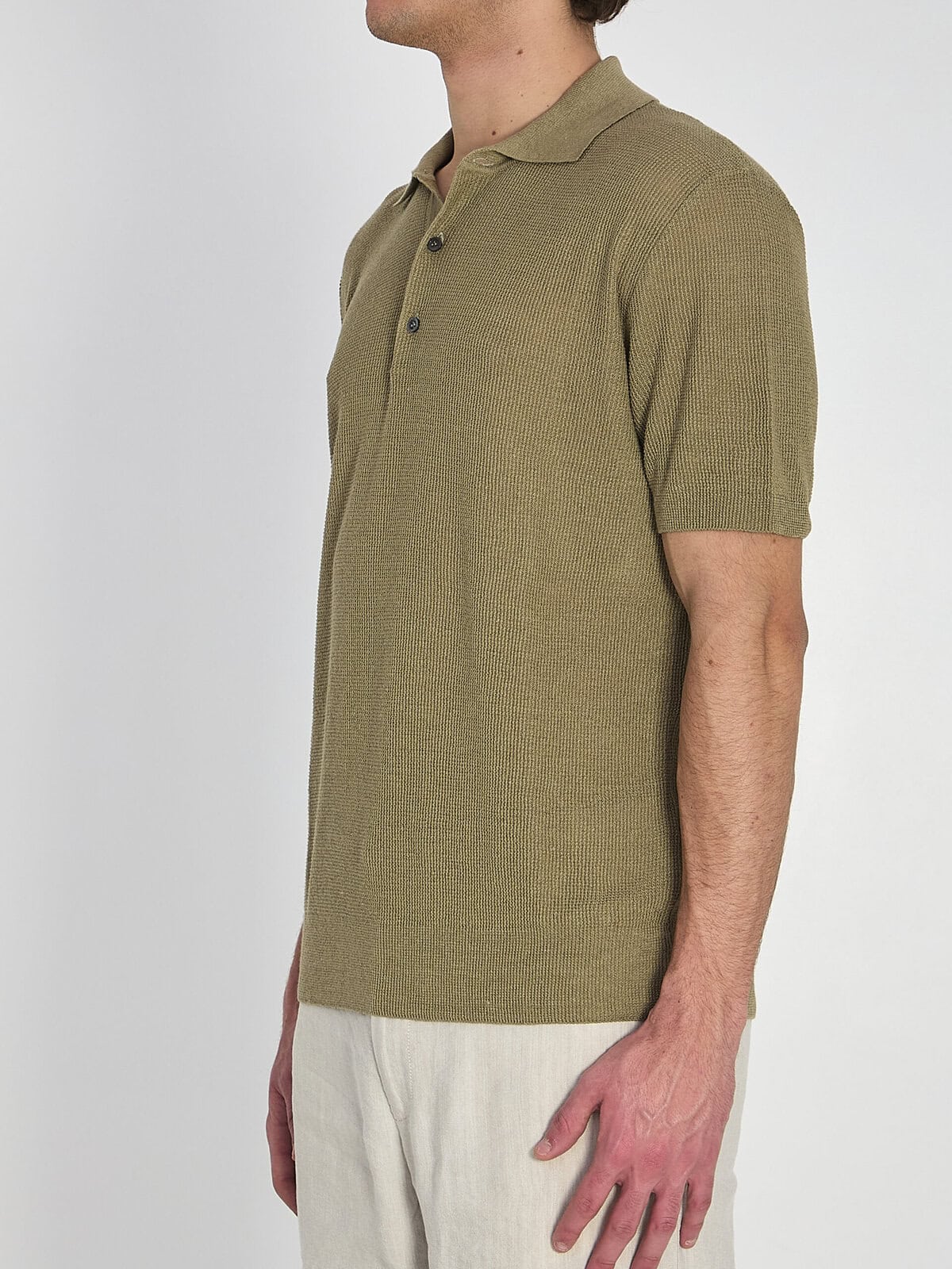 Sage green breathable polo shirt in linen and cotton knit. Features a pointed collar, a three-button polo placket at the front, and short sleeves. Regular fit.