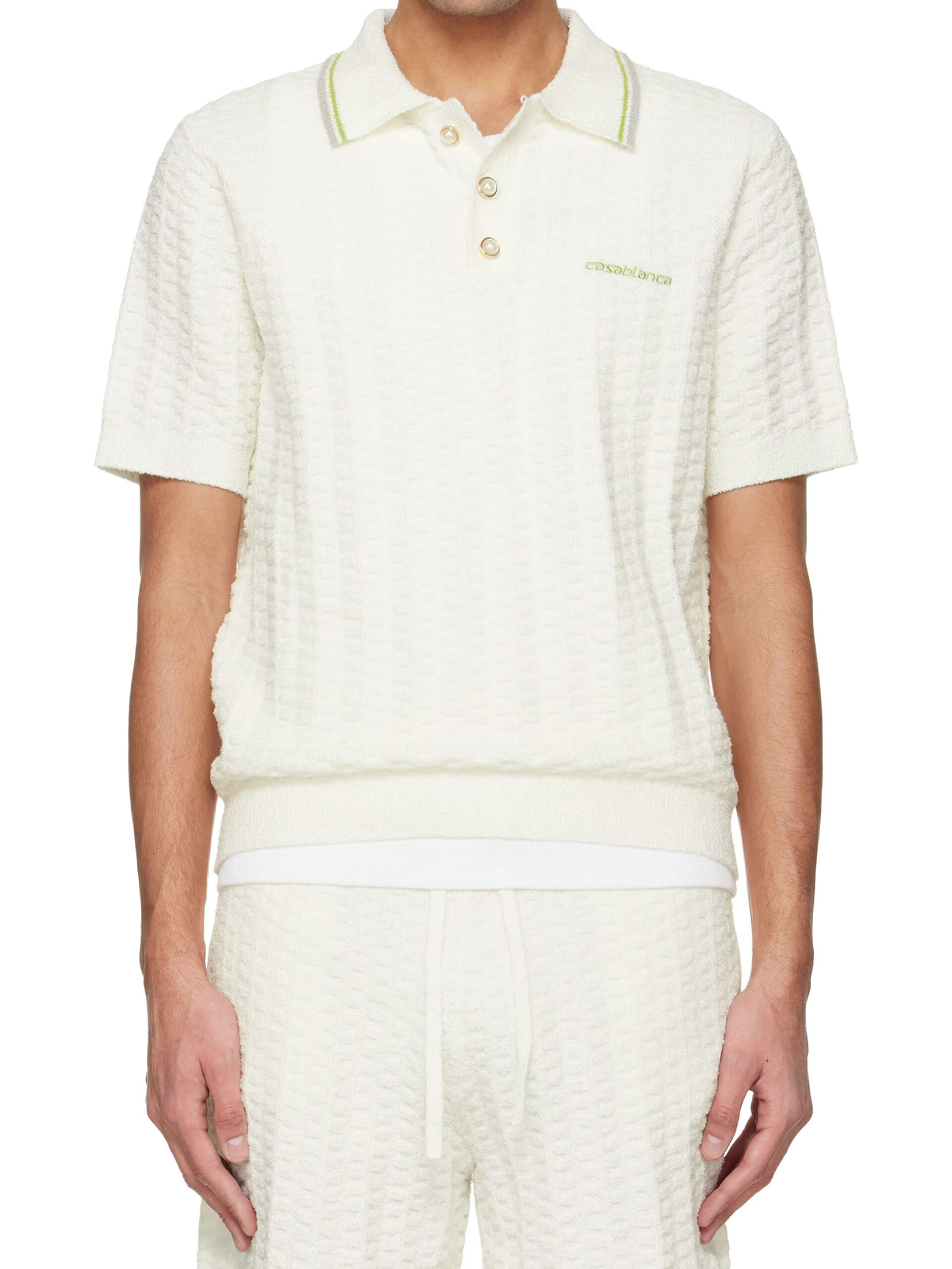 White cotton-blend bouclé fabric polo shirt. It features a point collar with grey and green details, a three-button placket, short sleeves, an embroidered Casablanca signature on the chest, and ribbed trims. Comfortable fit.