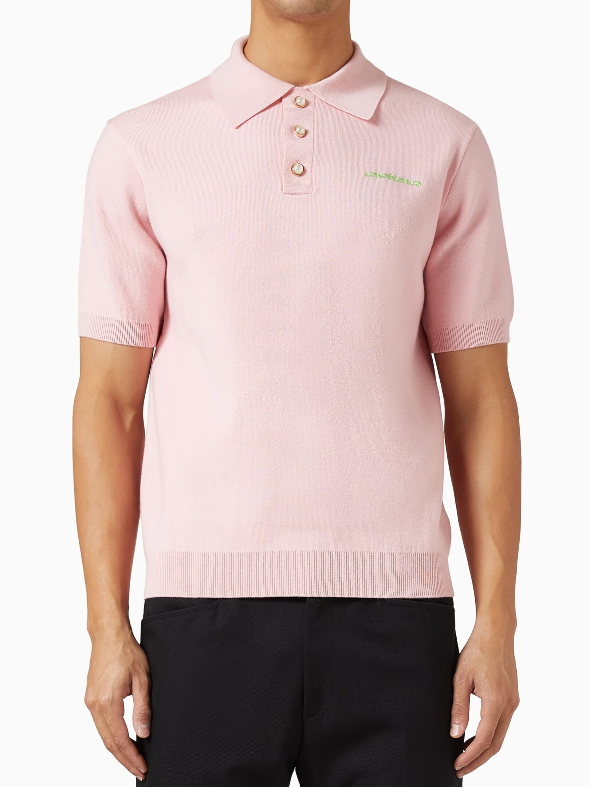 Pink wool-blend polo shirt. It features a point collar, a three-button placket, short sleeves, a contrast embroidered Casablanca signature on the chest, and ribbed trims. Regular fit.