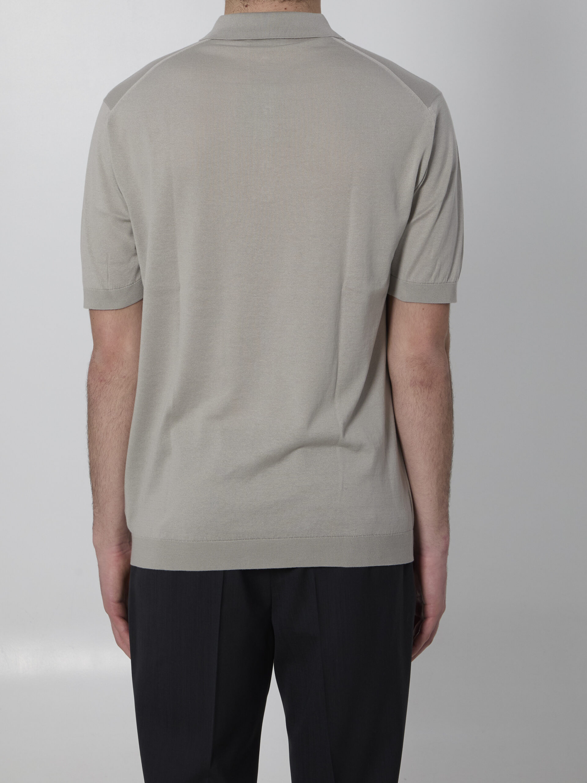 Mastic grey Sea Island cotton polo shirt. Features spread collar, three-button front closure, short sleeves, ribbed trims. Slightly fitted fit.