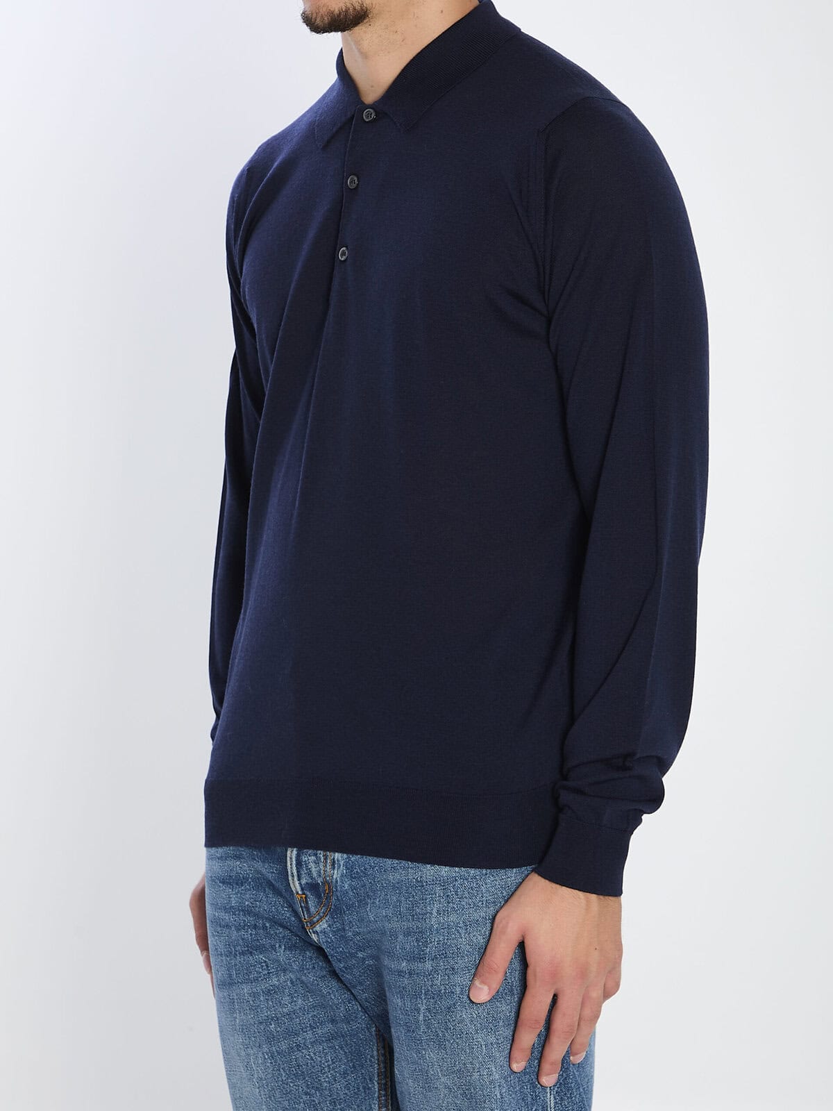 Merino wool polo shirt in midnight blue. Features a pointed collar, a three-button placket, and ribbed cuffs and hem. Regular fit.