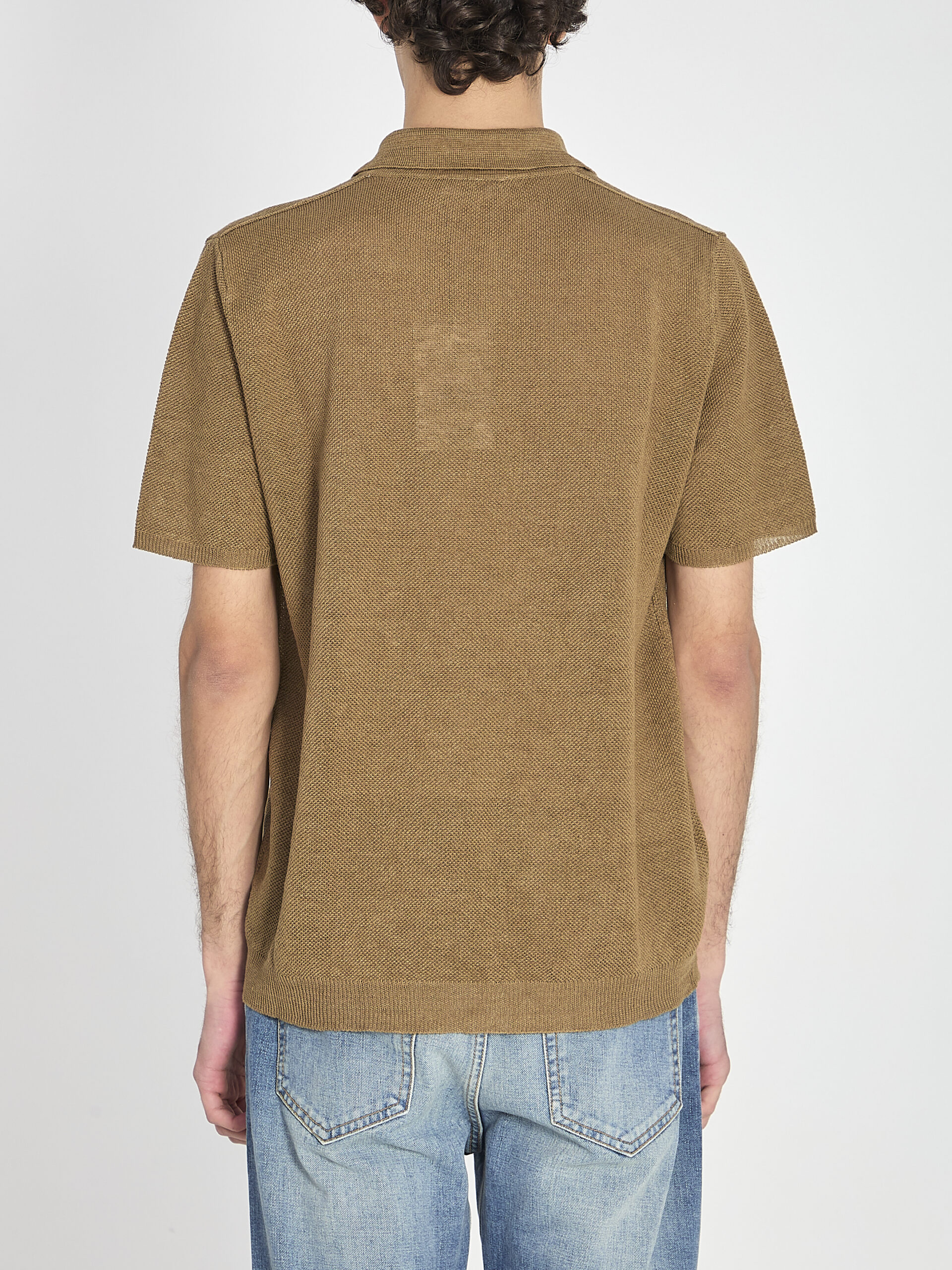 Polo shirt in Khaki green linen piqué. It features a pointed collar, short sleeves, and a ribbed trim. Relaxed fit.