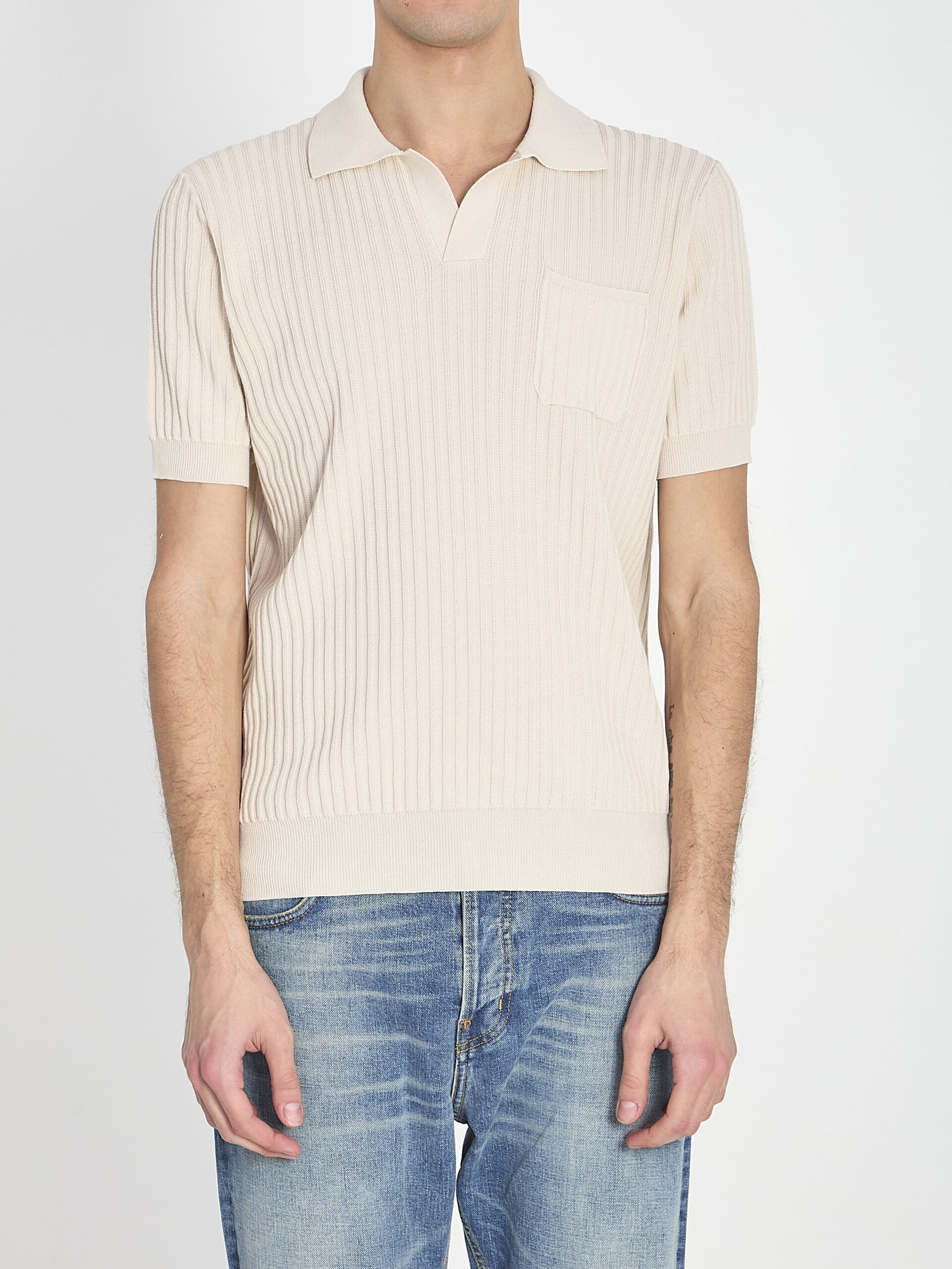 Polo shirt in ecru cotton. It features an all-over ribbed knit, a pointed collar, short sleeves, one chest patch pocket, and a ribbed trim. Regular fit.