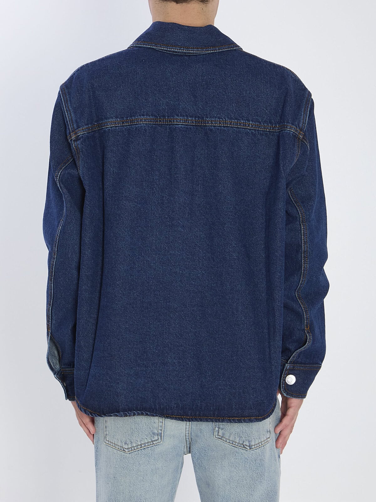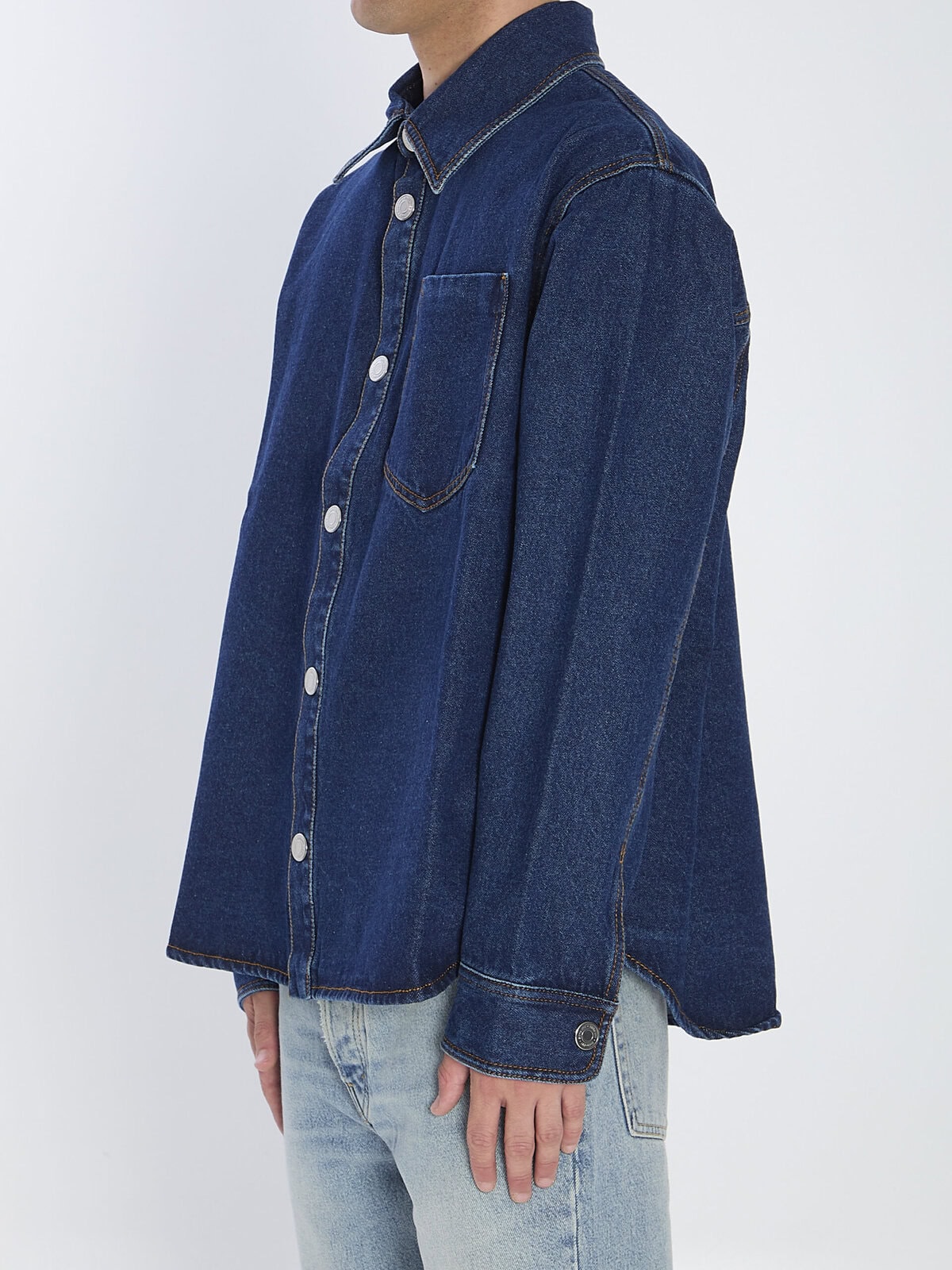 Overshirt in indigo blue cotton denim. Features a pointed collar, front button closure, patch chest pocket with Ami de Coeur embroidery, long sleeves, buttoned cuffs, and a slightly rounded hem. Regular fit.