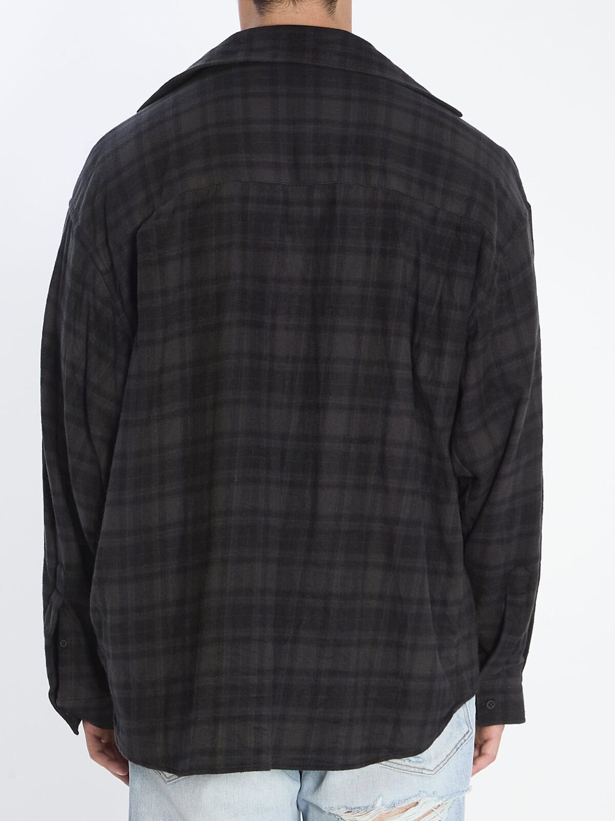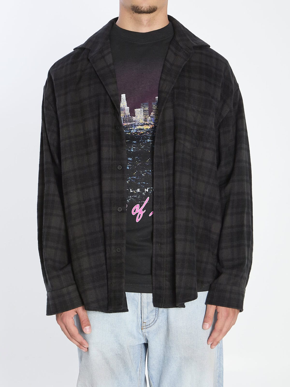 Shirt made of regenerated cotton poplin and dry jersey in black. Features a trompe-l’œil shirt-over-T-shirt effect with layered construction, shirt-style collar, front button closure, chest patch pocket, long sleeves, buttoned cuffs, and rounded hem. “City of Angels” print on the T-shirt layer. Oversized fit.