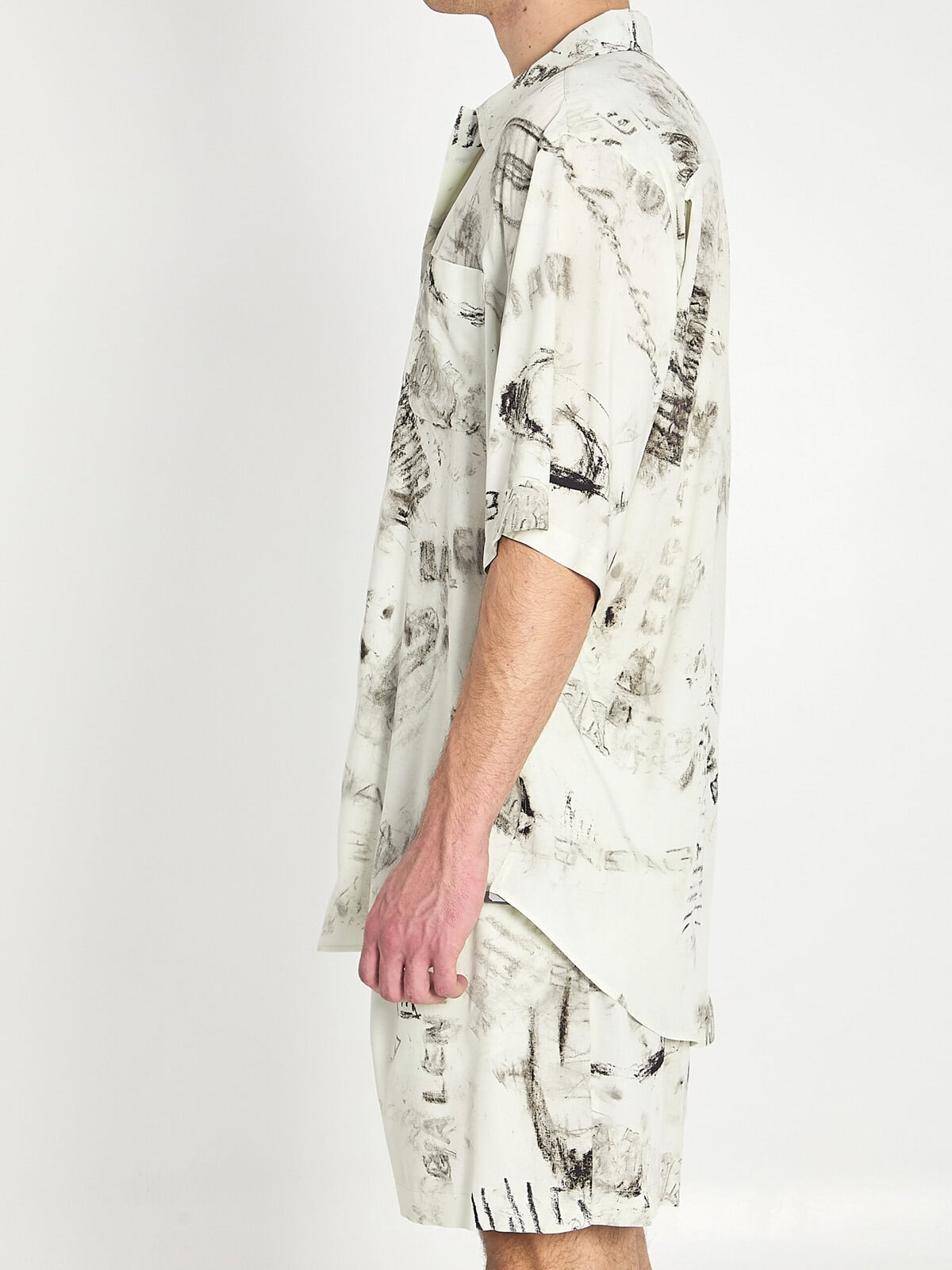 Gray viscose shirt with an all-over black print. It features a pointed collar, a button front closure, short sleeves, a chest patch pocket, and a rounded hem. Oversized fit.