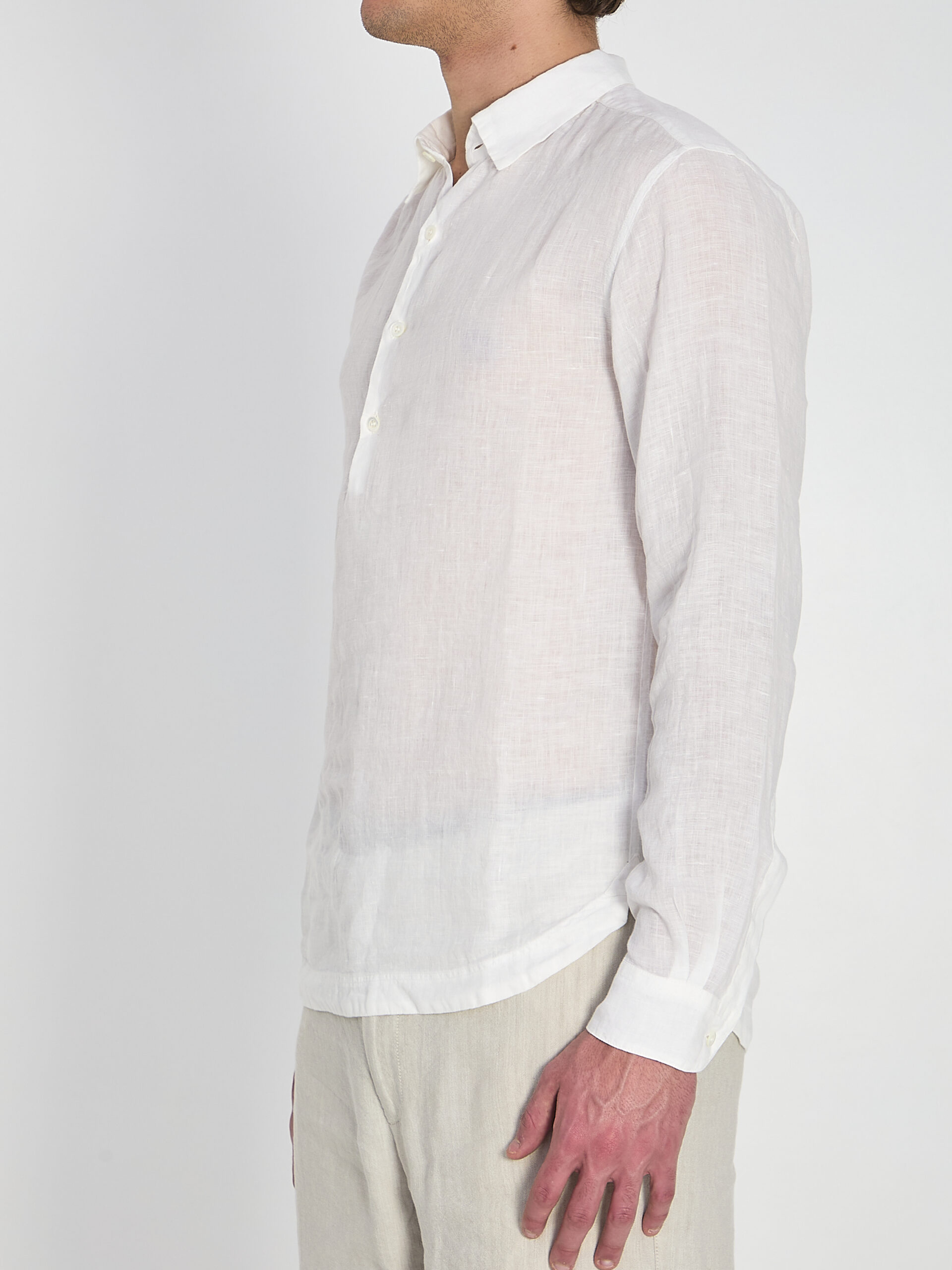 White linen shirt. Features a pointed collar, a mid-chest button closure, long sleeves, button cuffs, a rounded hem, longer at the back. Relaxed fit.