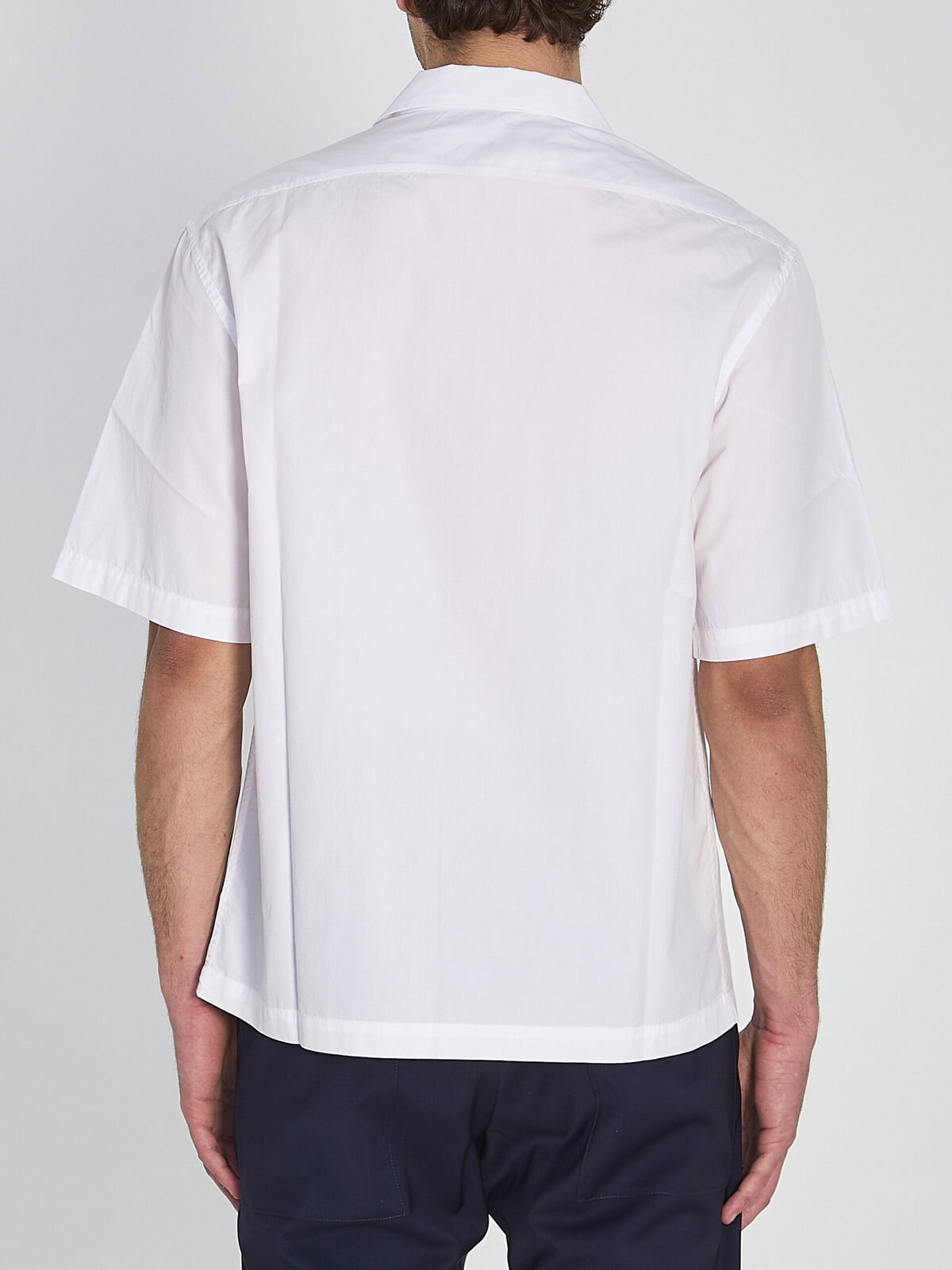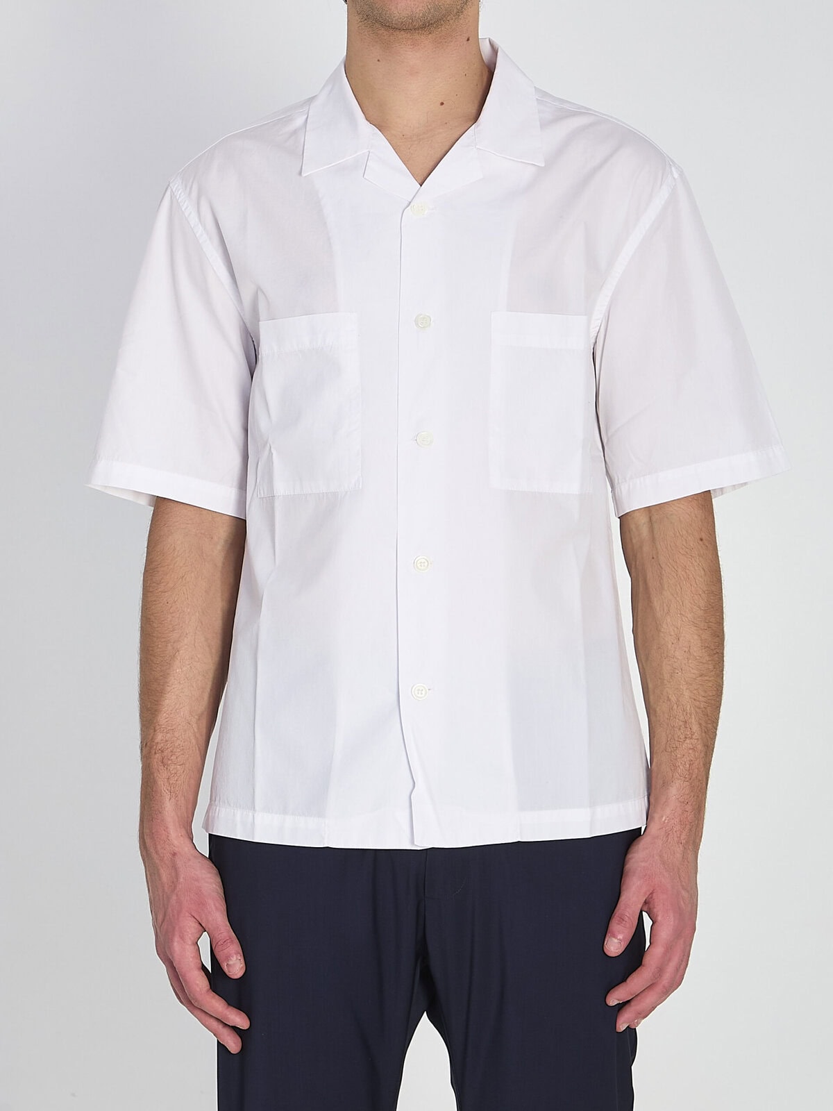 White double cotton poplin shirt. Features a camp collar, a front button closure, short sleeves, two patch pockets on the chest, and a straight hem. Regular fit.