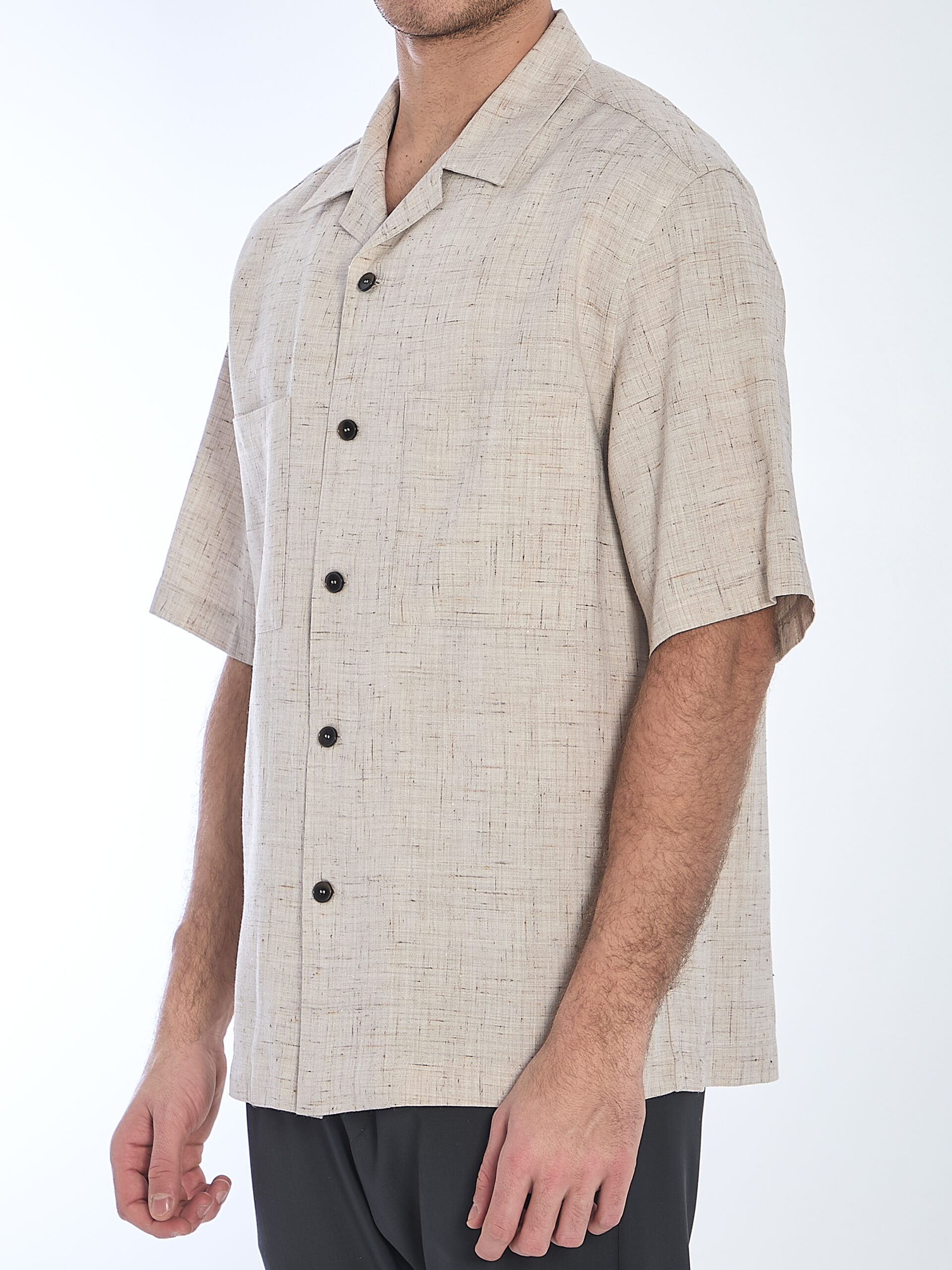 Solana Gresto shirt in textured melange beige viscose. It features an open collar with lapels, a front button closure, dropped shoulders, and two patch pockets on the chest. Relaxed fit.