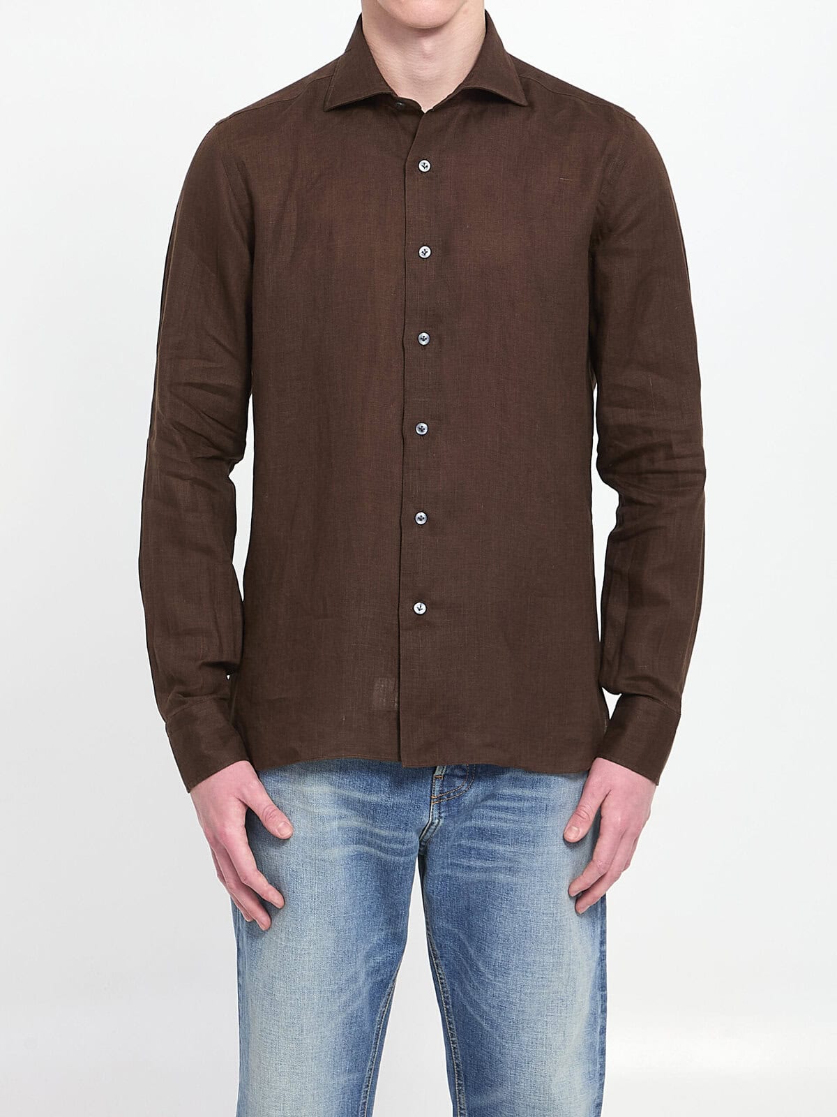 Brown linen shirt. Features a French collar, button front closure, long sleeves, button cuffs, rounded hem. Regular fit.