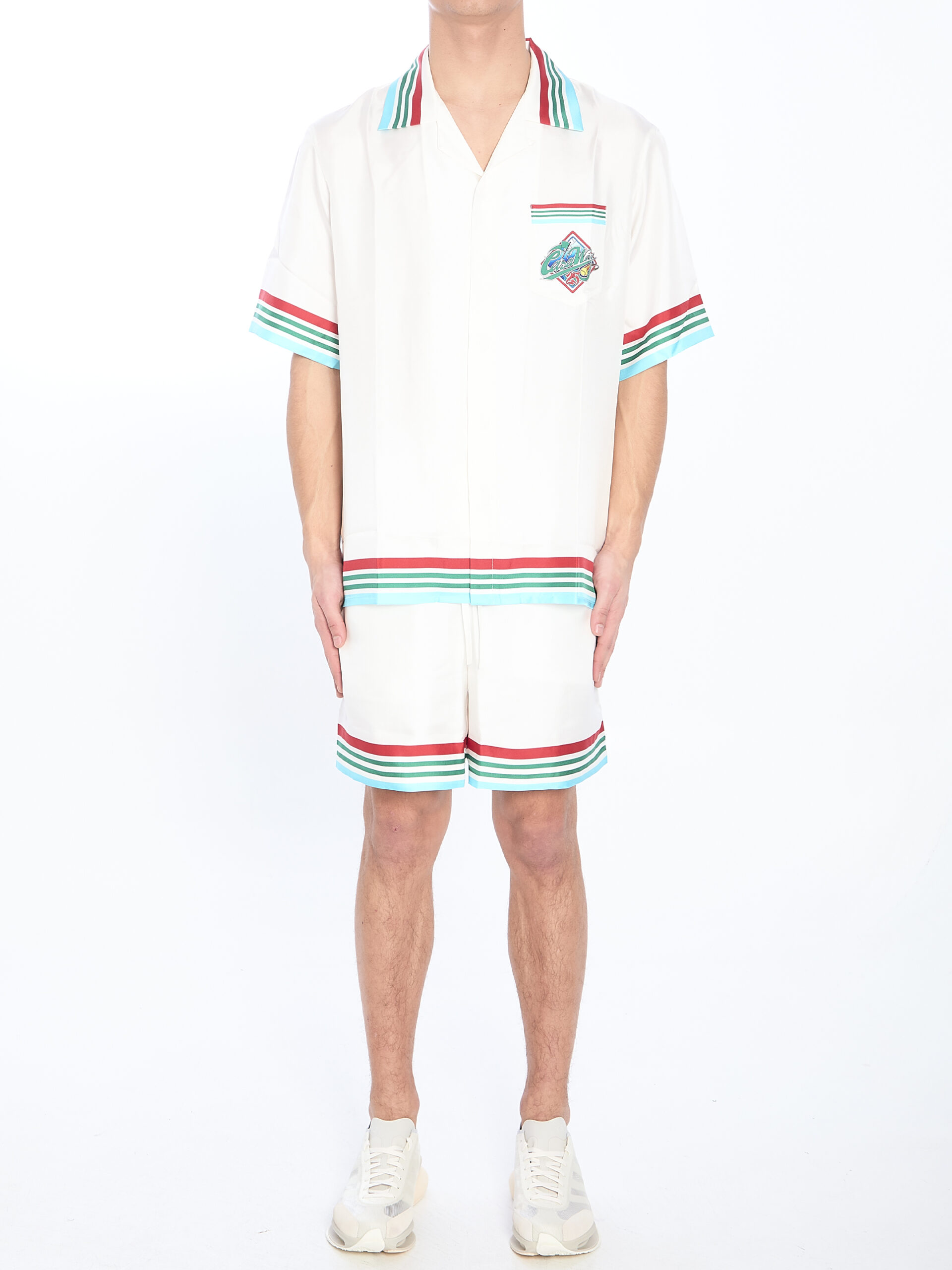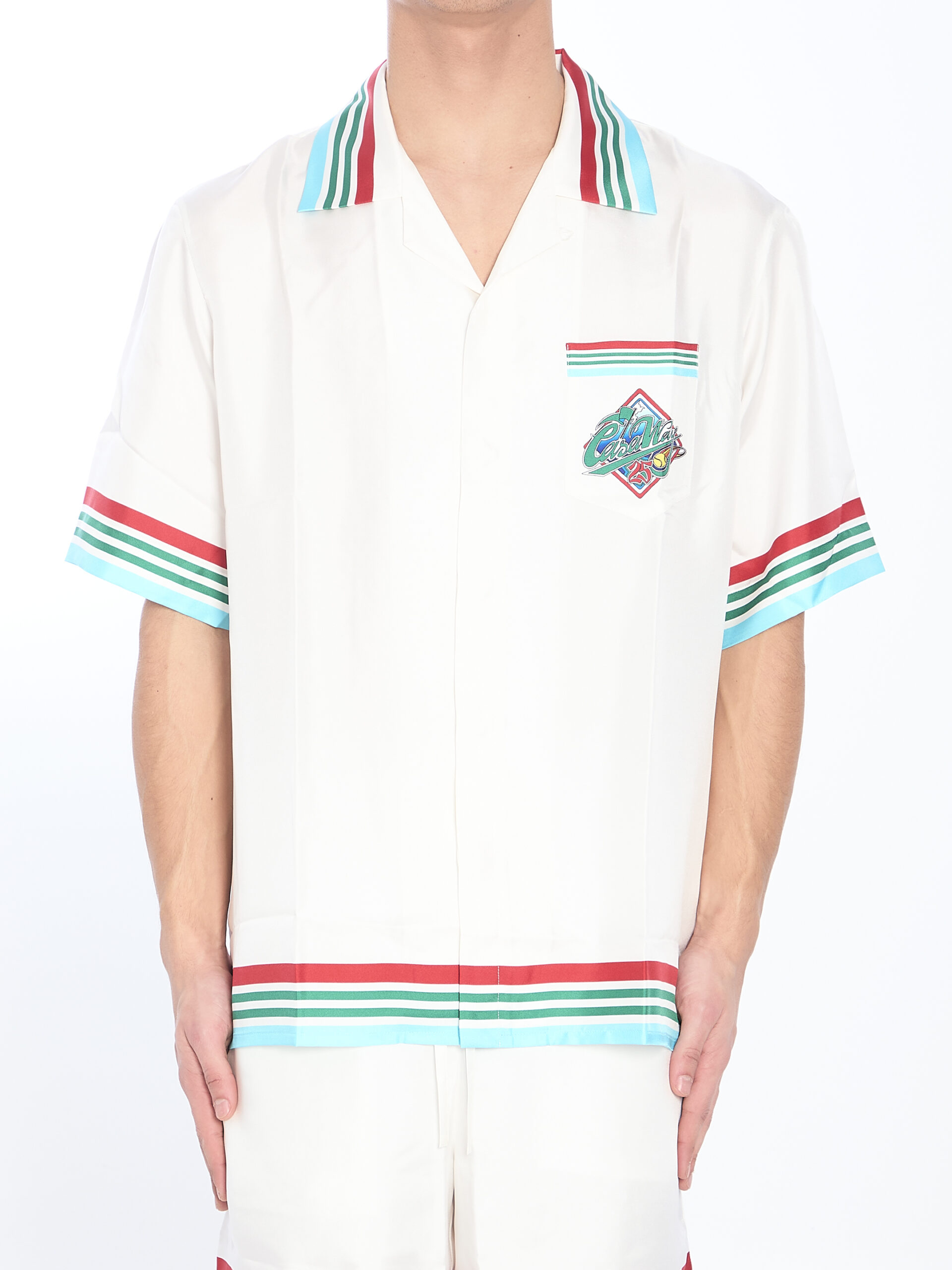 Short-sleeved white silk twill Casa Way World Series shirt. It features a classic collar with green, blue, and red striped detailing, a chest pocket with the Casa Way Tennis logo and matching green, blue, and red stripes, a large Casa Way Tennis logo on the back, and the sleeves and bottom hem finished with green, blue, and red stripes.
