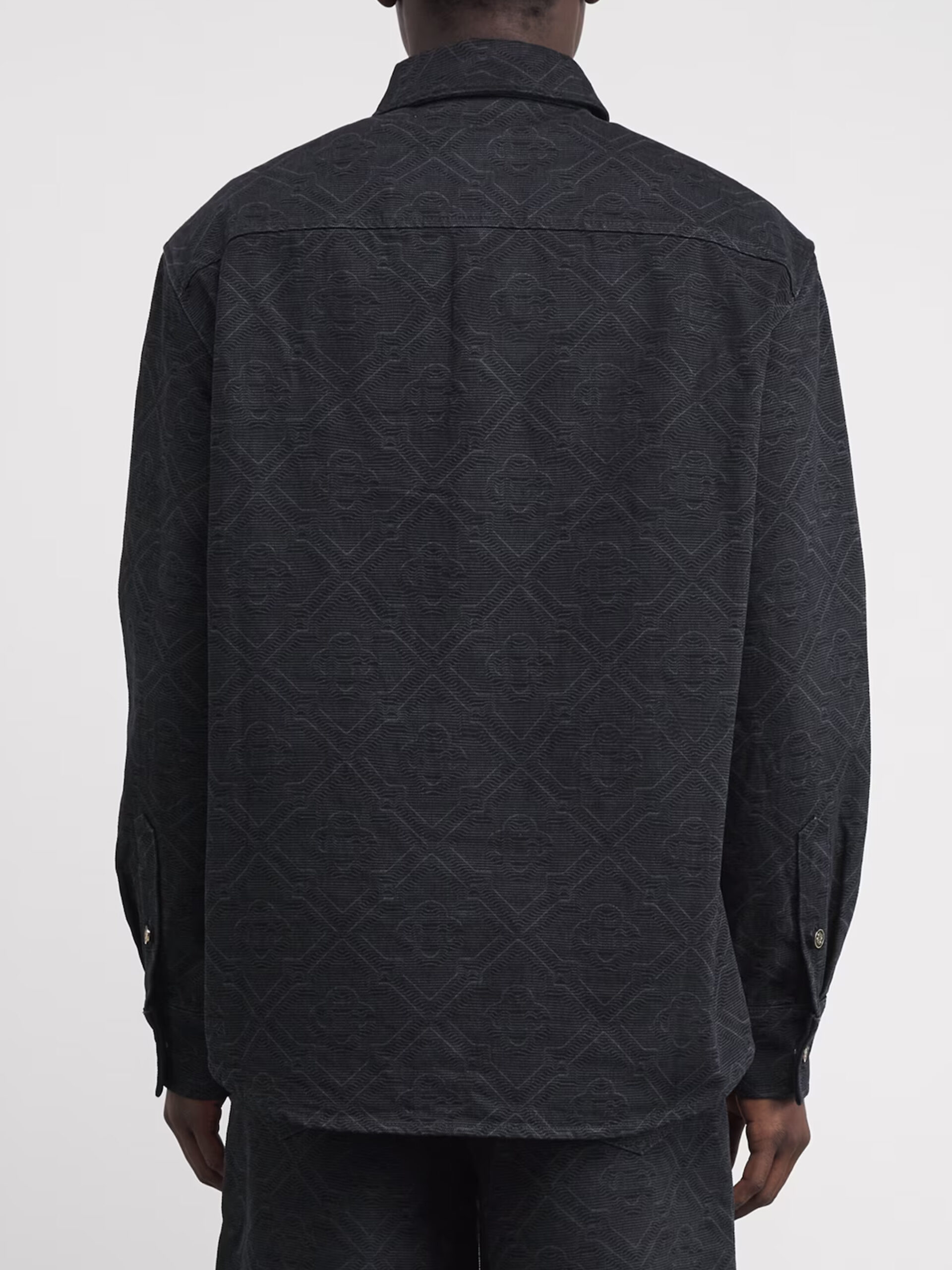 Black cotton denim overshirt with an all-over laser monogram. It features a point collar, a button-front closure, long sleeves with logo button cuffs, two patch flap button pockets on the chest, and a rounded hem. Oversized fit.
