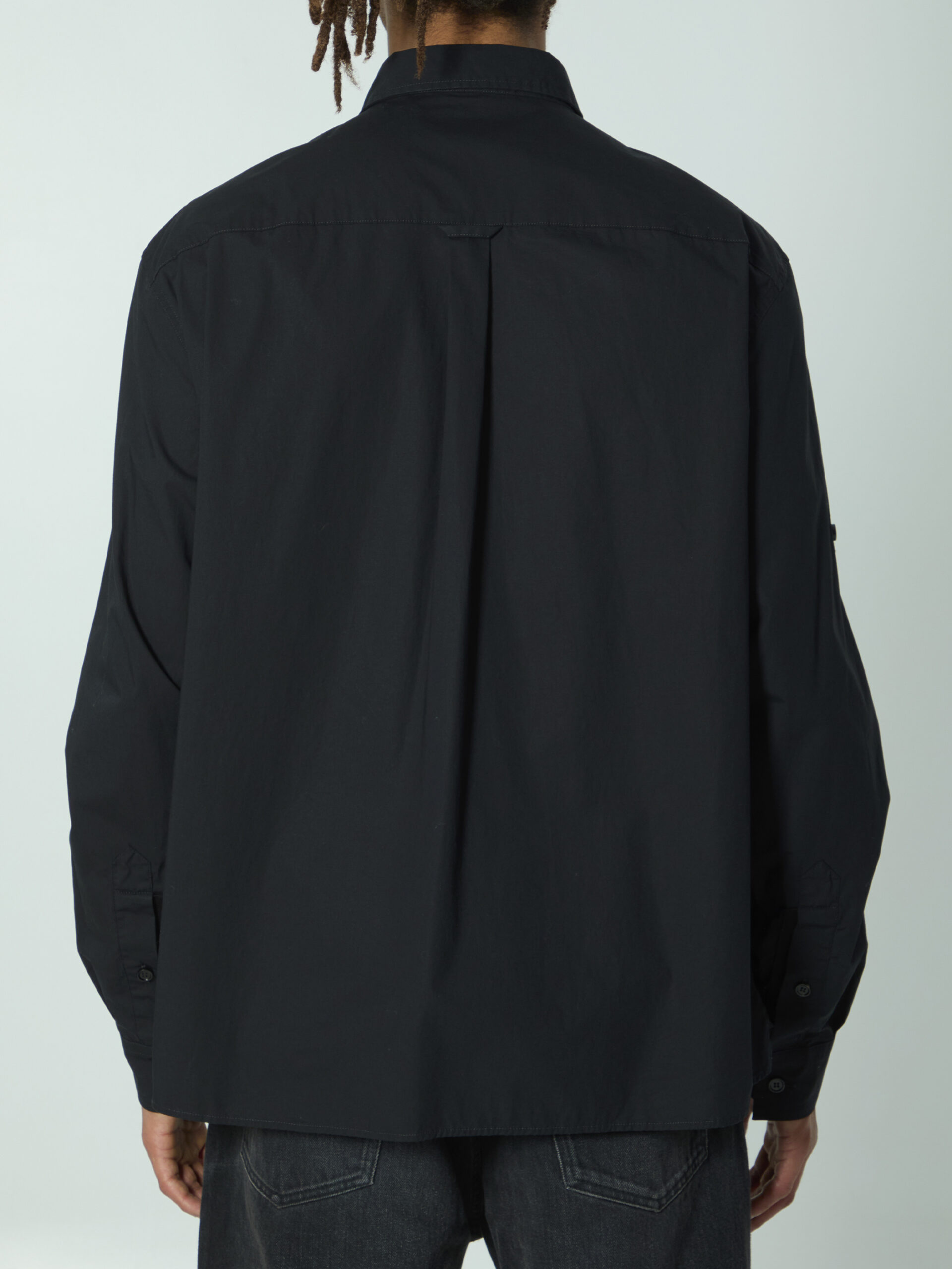 Black military-style stretch cotton shirt. Features a point collar with applied Dolce & Gabbana metal logo, front button closure, long sleeves, button cuffs, two patch pockets on the chest, straight hem. Regular fit.