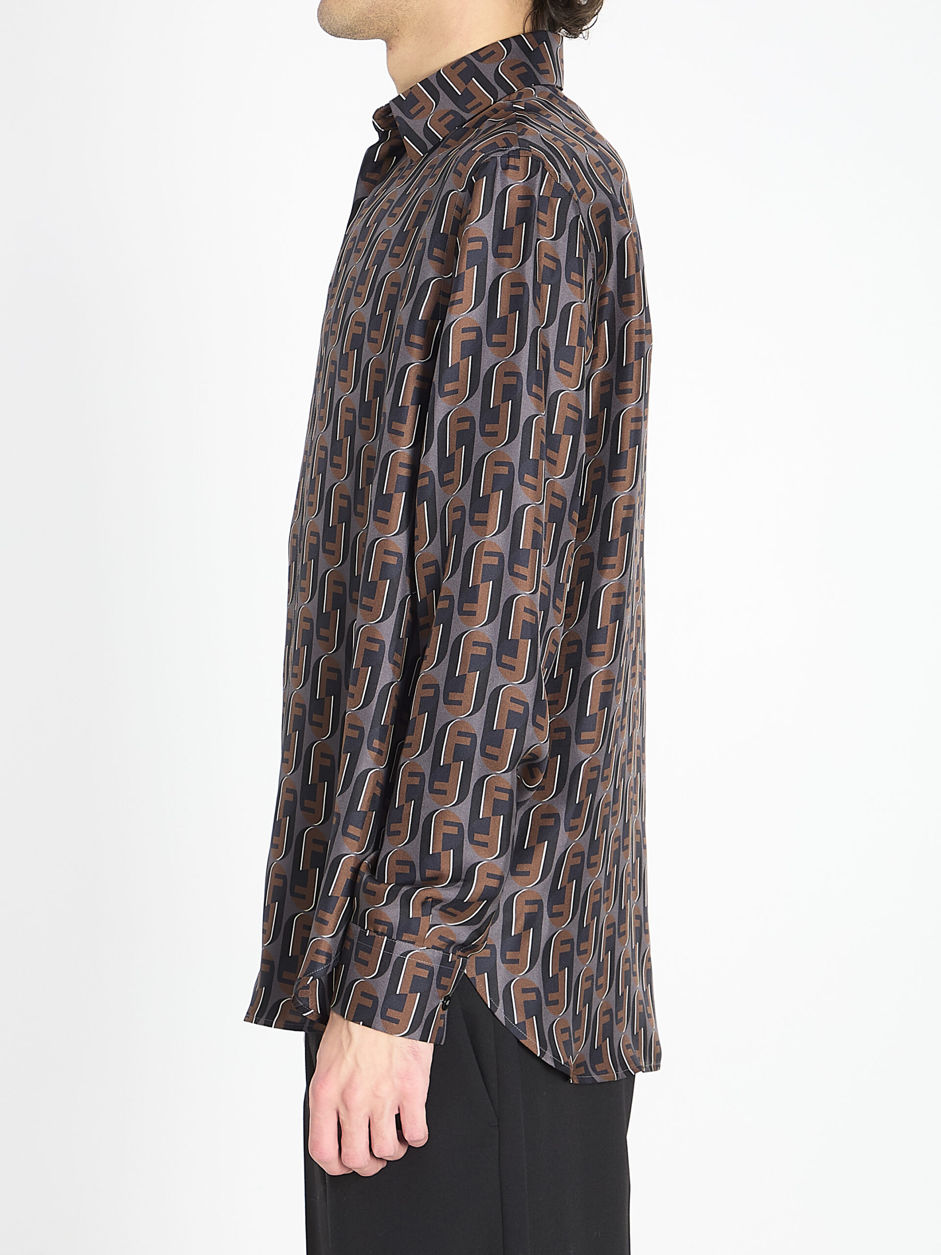 Silk shirt with a Fendinity print in dark blue, brown, and gray tones. It features a pointed collar, front button closure, long sleeves with button cuffs, and a rounded hem. Comfortable fit.