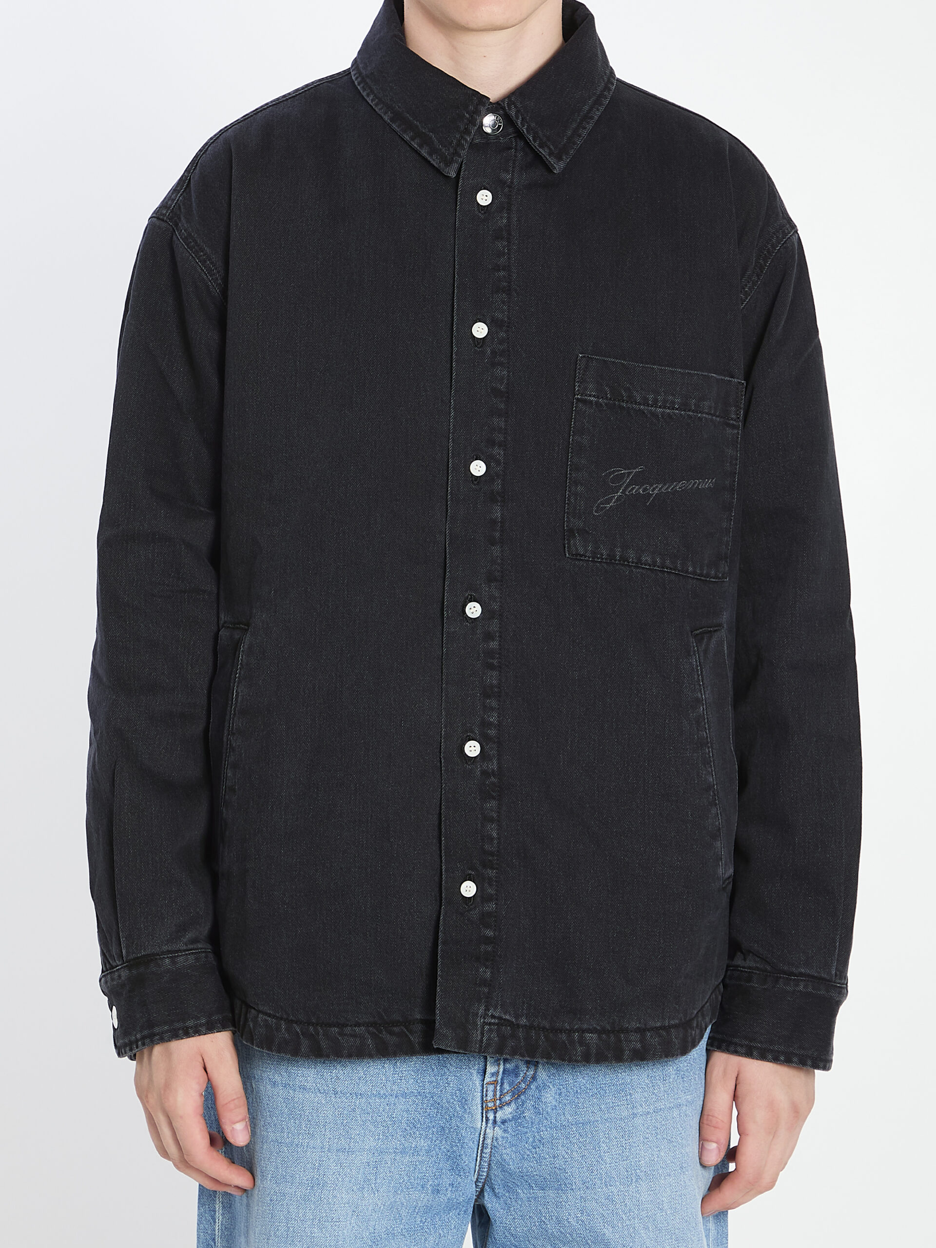 Padded shirt-jacket in washed black denim. Features a pointed collar with an engraved metal button, front closure with mother-of-pearl buttons, front chest pocket with laser-printed logo, welt side pockets, buttoned cuffs, back yoke with J-shaped loop. Boxy fit.