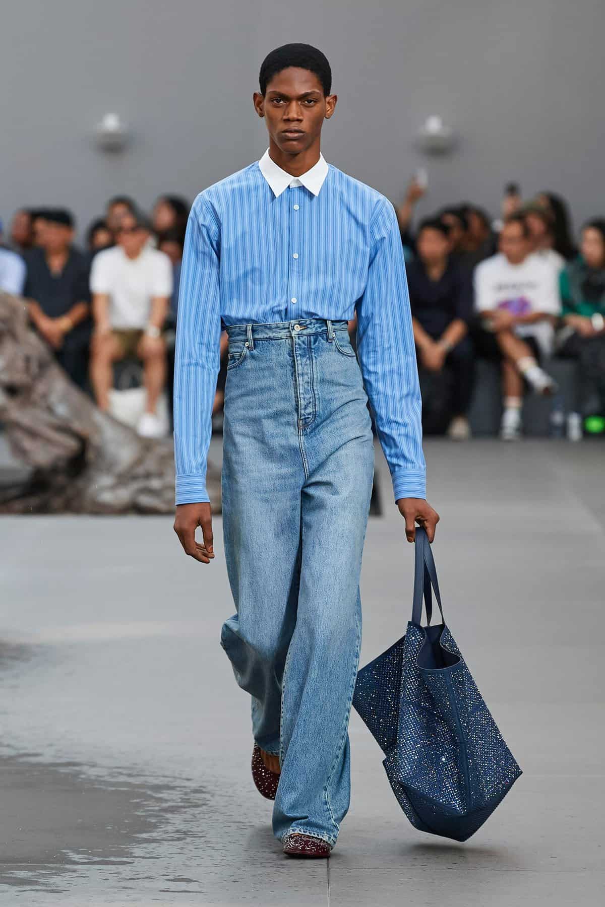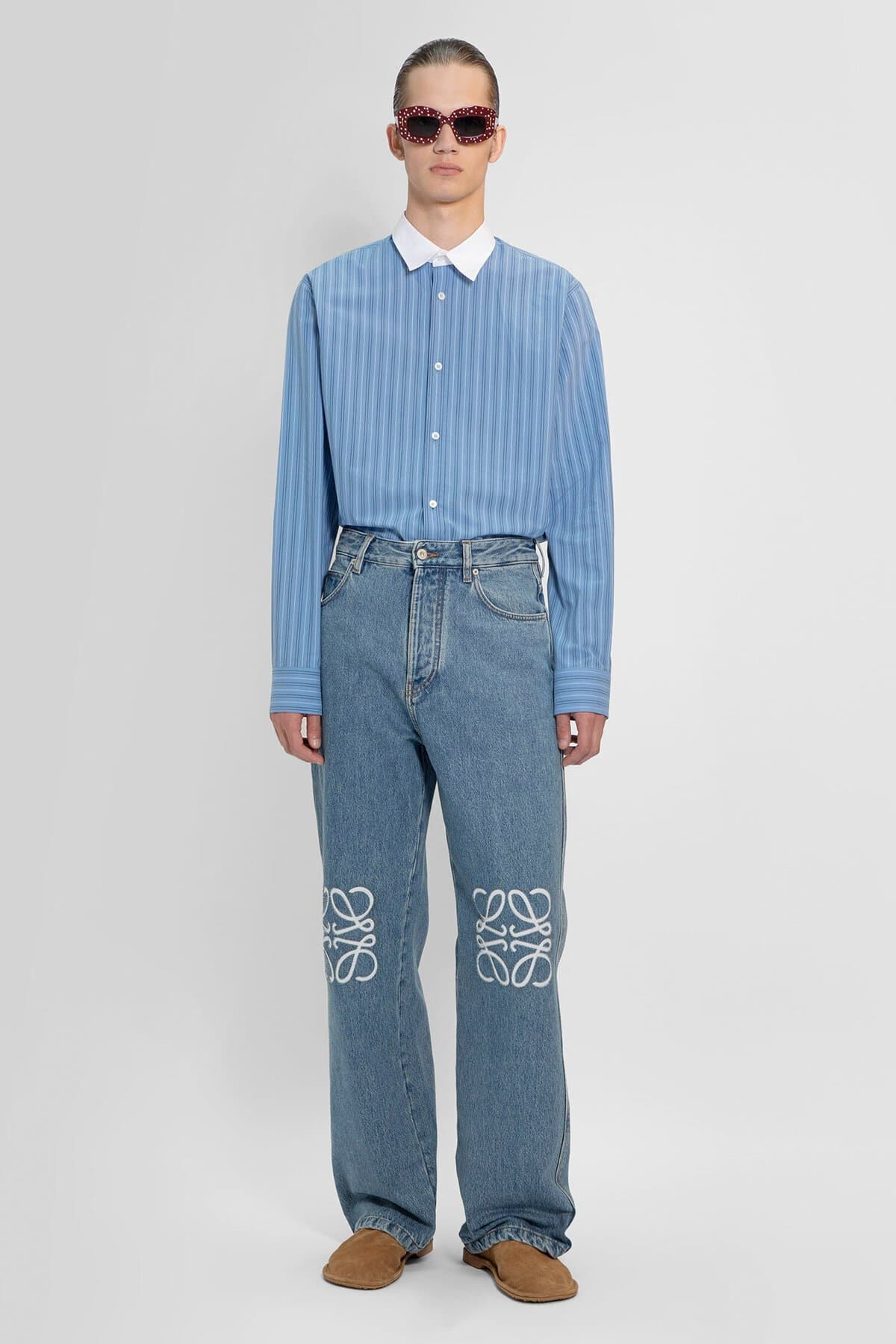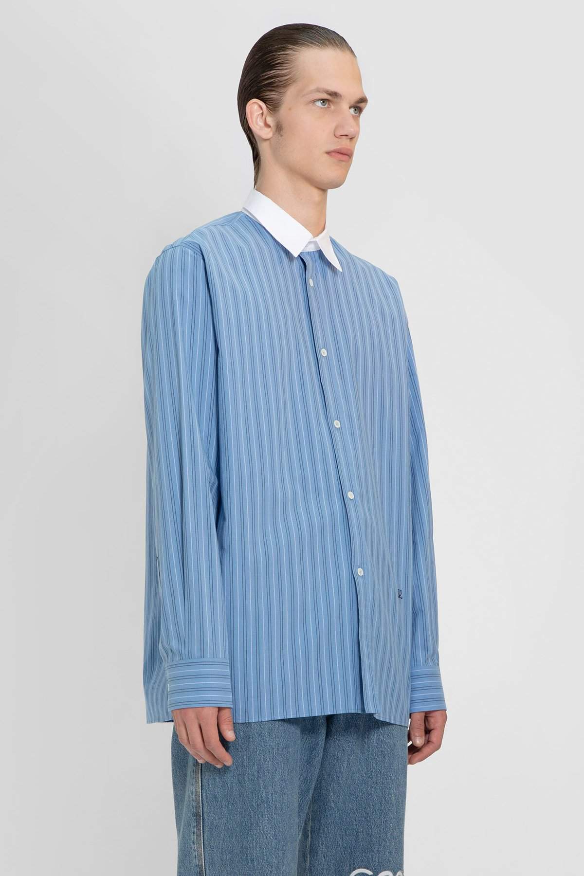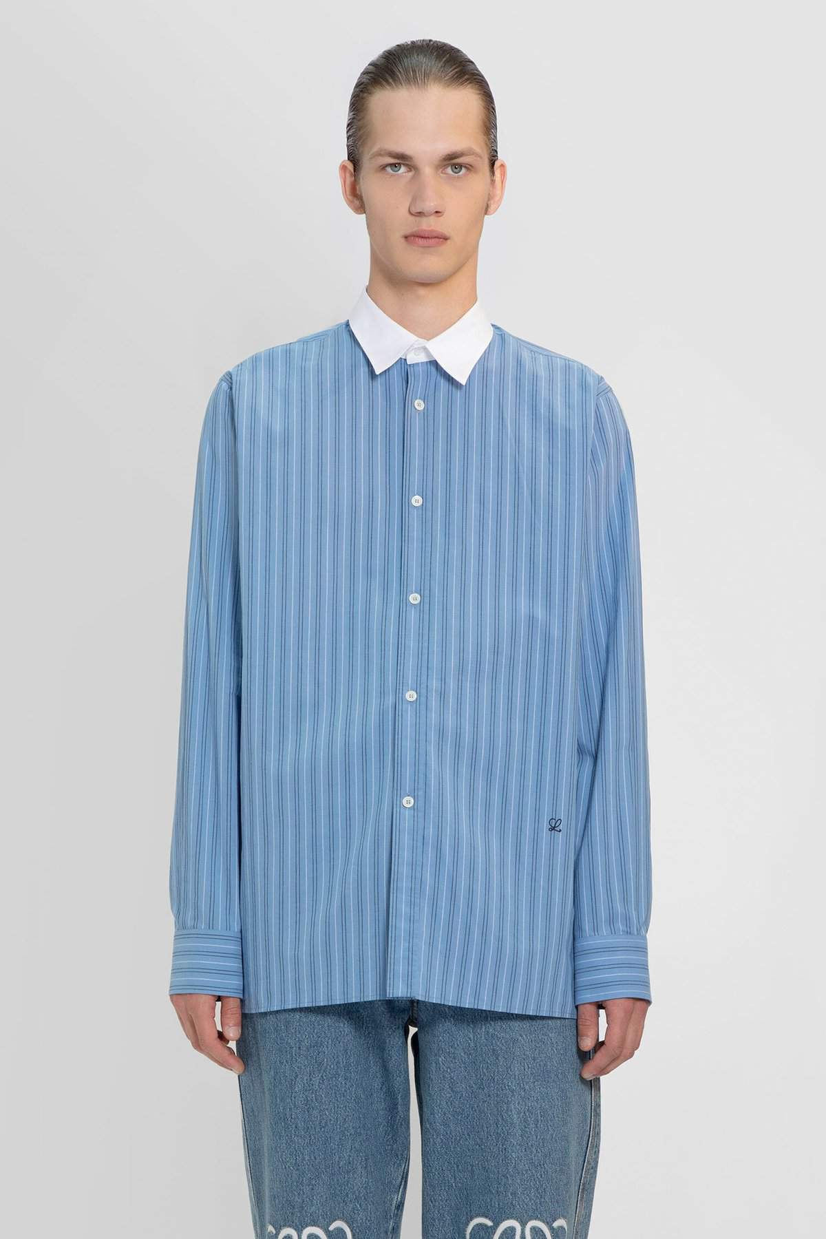 Runway style Stone blue Pinstriped Classic collar Button closure Fornt l monogram Long sleeves Dropped shoulders Buttoned cuffs