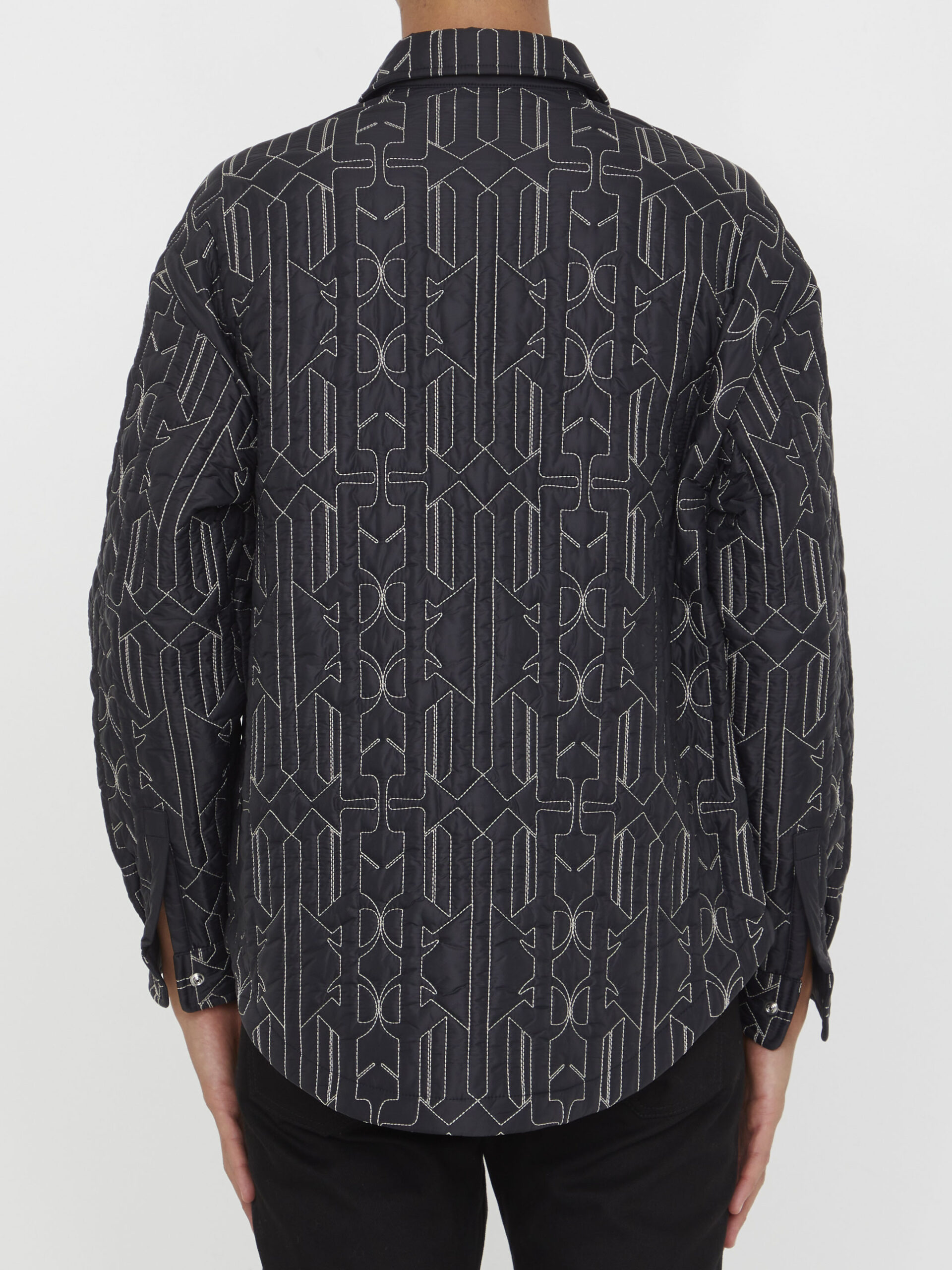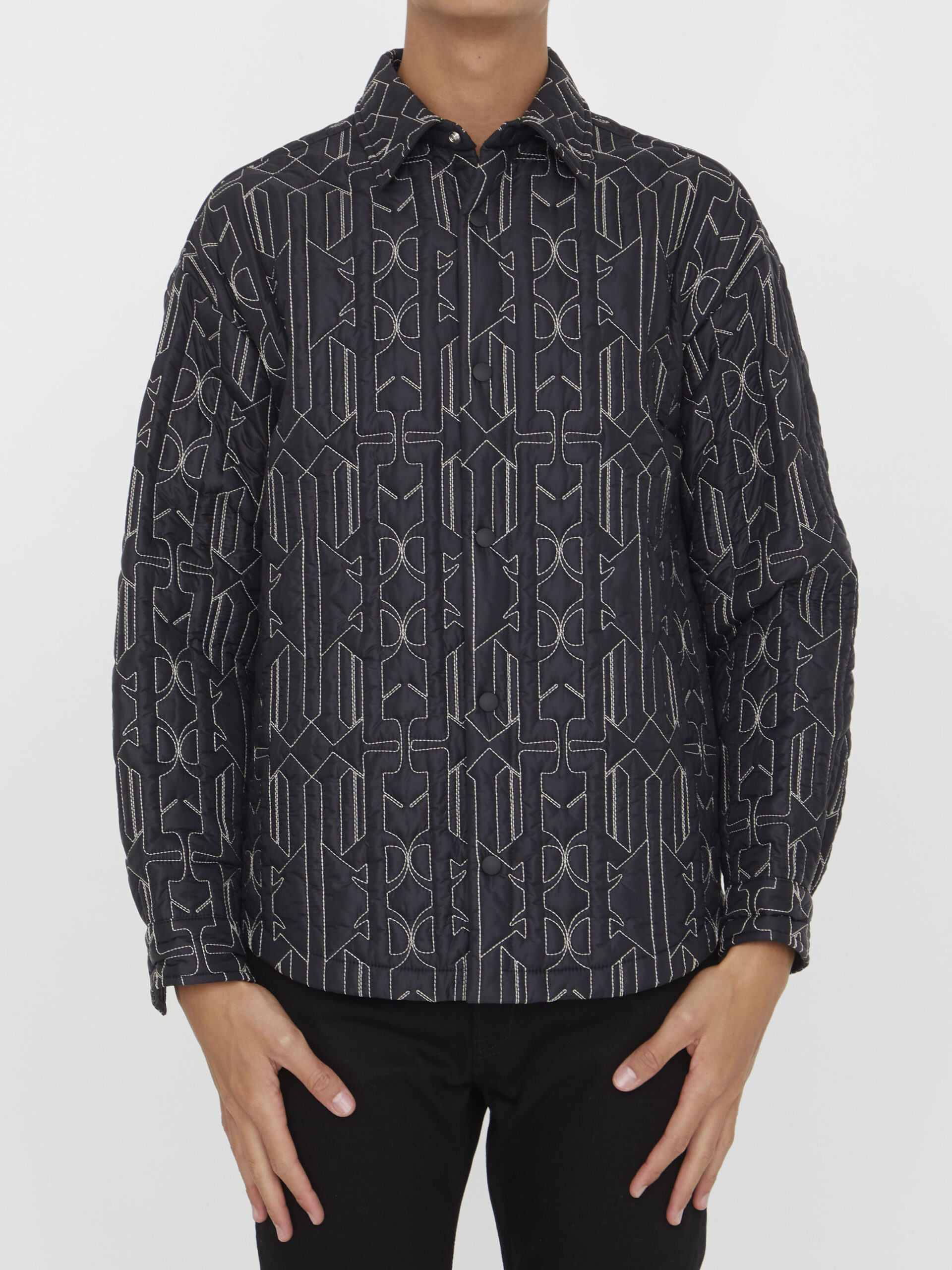 Anthracite quilted nylon jacket with all-over All Monogram motif. It features shirt collar, front press-stud closure, two side press-stud welt pockets and press-stud cuffs. Curved hem. Regular fit.