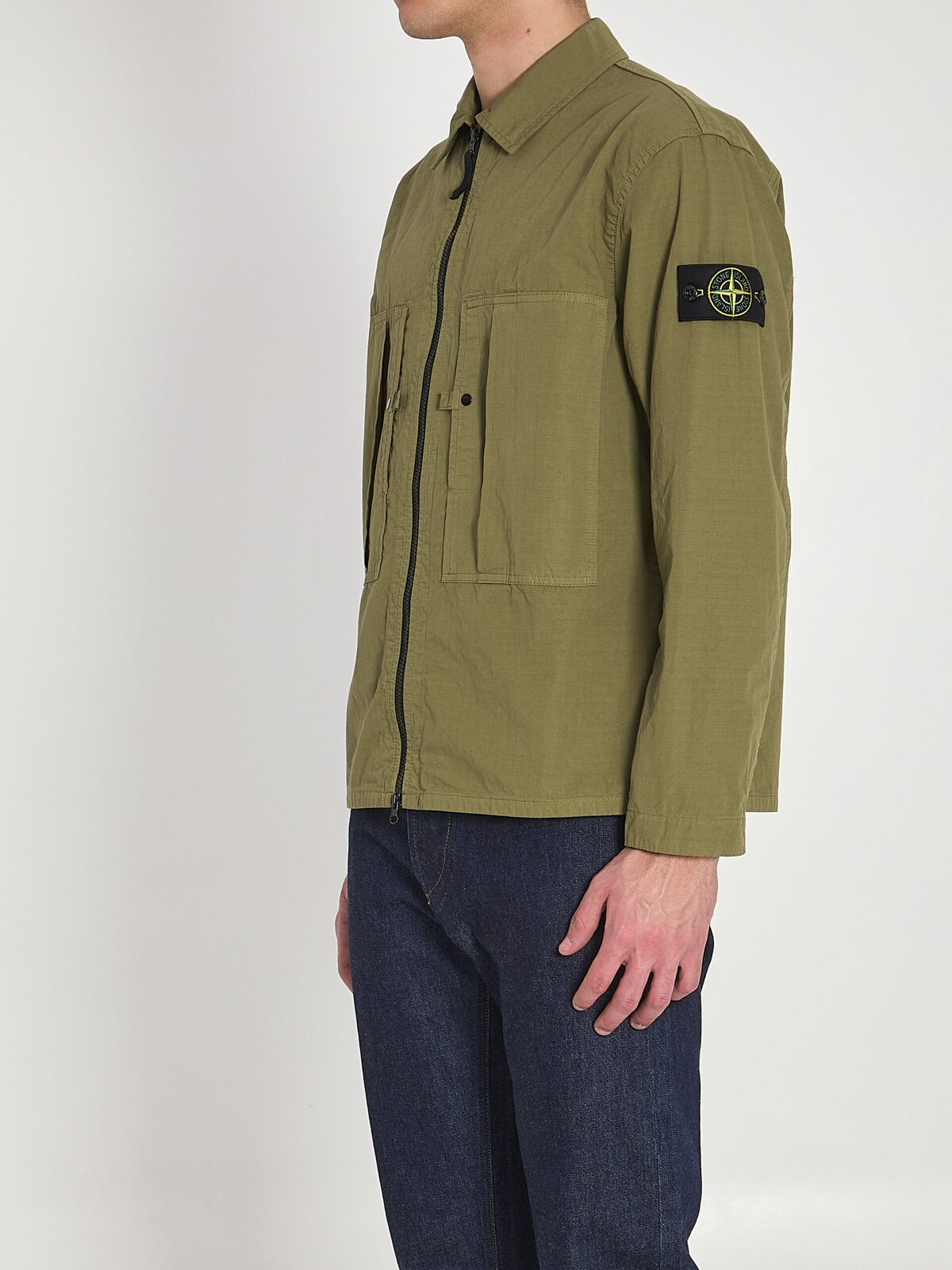 Military green ripstop cotton overshirt. It features a pointed collar, a zip front closure, two front button pockets, long sleeves, and an iconic applied badge on the sleeve. Comfortable fit.