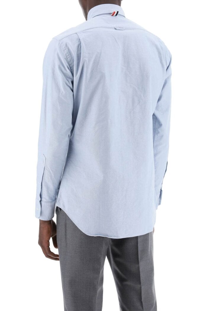 This Thom Browne’s button-down shirt is cut from Oxford cotton and finished with a striped grosgrain band at the placket. It comes in a regular fit with a chest pocket, mitered cuffs, and curved hemline. The 4-Bar Tag and striped grosgrain loop tab complete the look. The model is 187 cm tall and wears a size 3 Thom Browne.