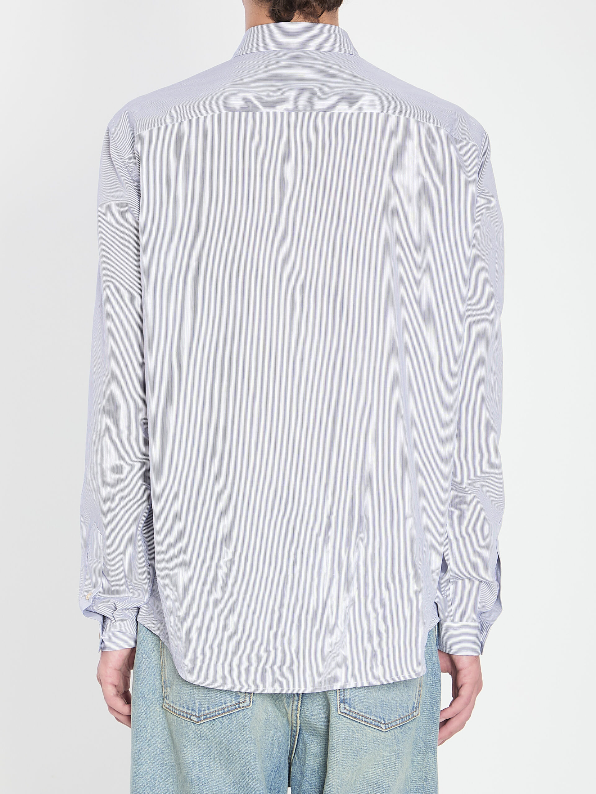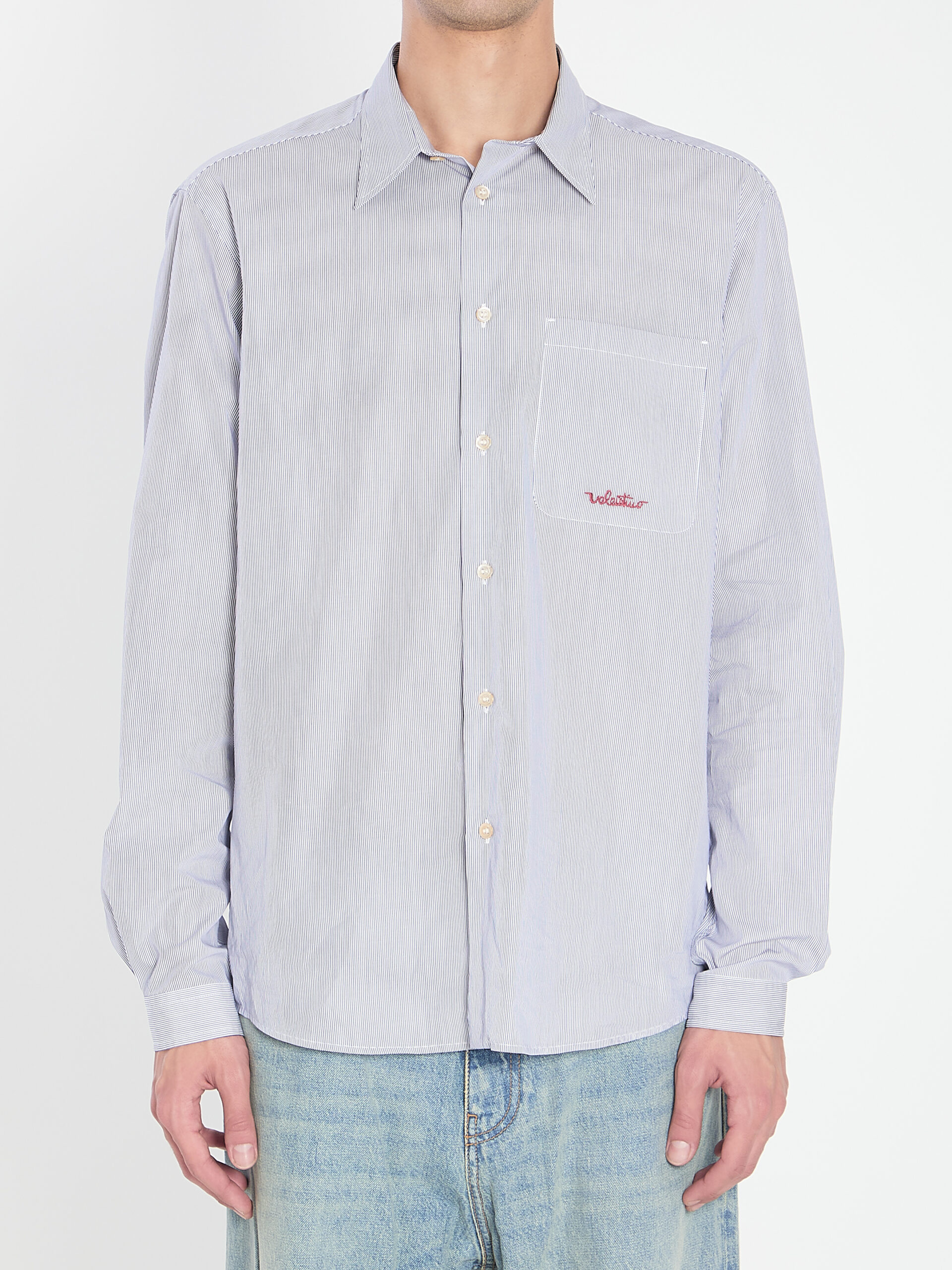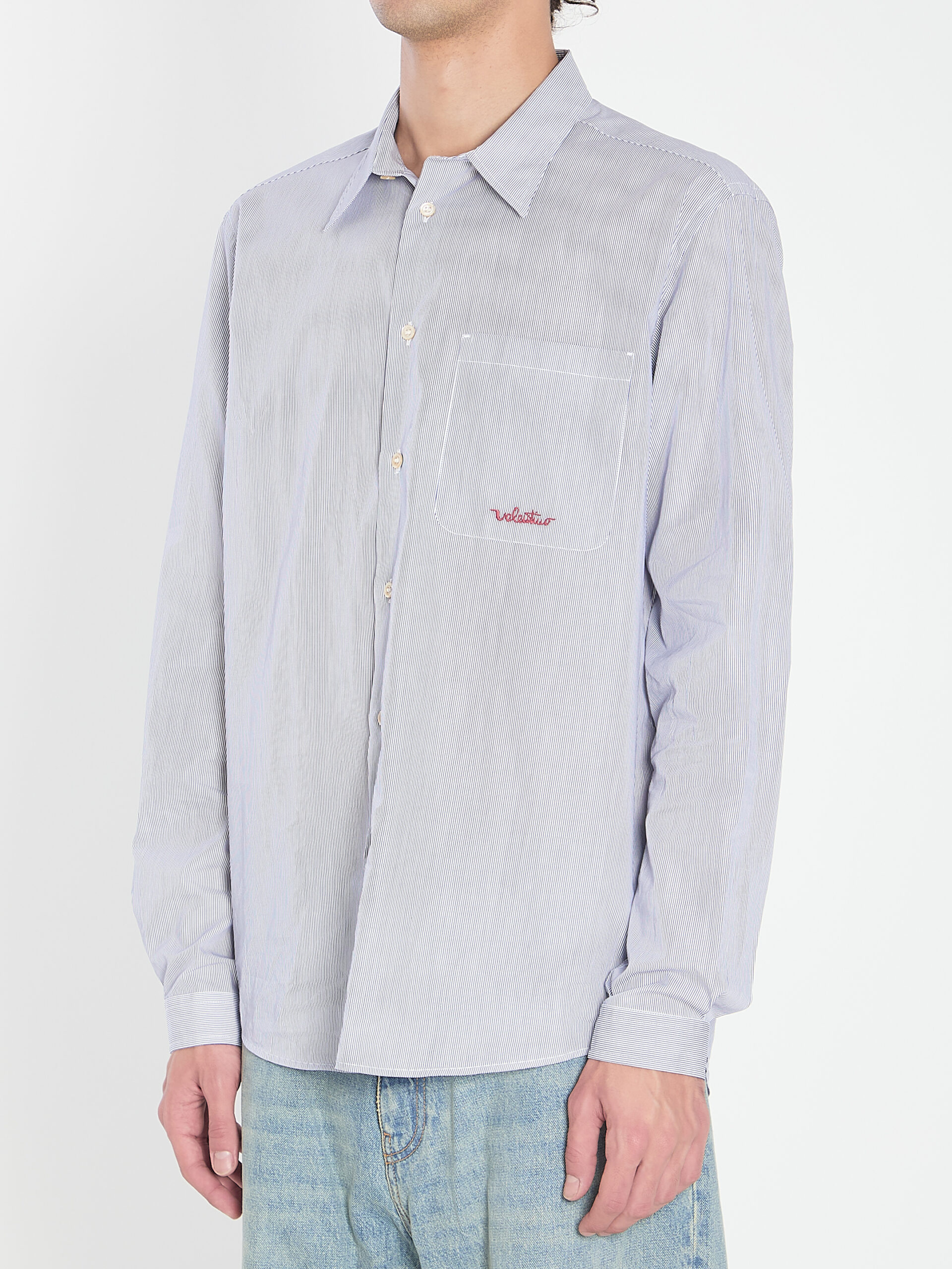 Long-sleeve shirt in light blue cotton. Features a fine stripe pattern, classic collar, chest pocket with red Valentino embroidery, front button placket, and buttoned cuffs.