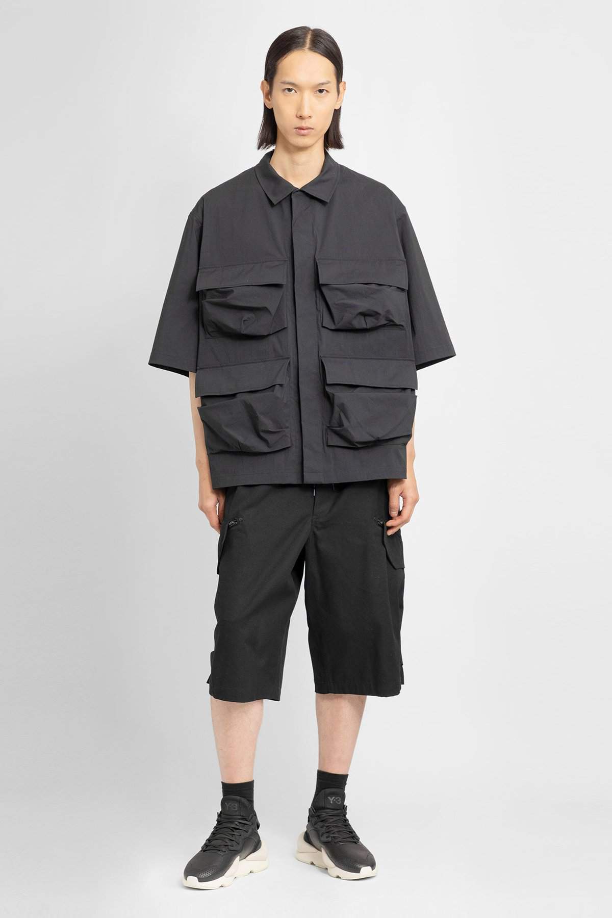 Black Elastic waistband with drawstrings Belt holes Press stud and zip closure Side pockets Cargo pockets Back logo print Back pockets