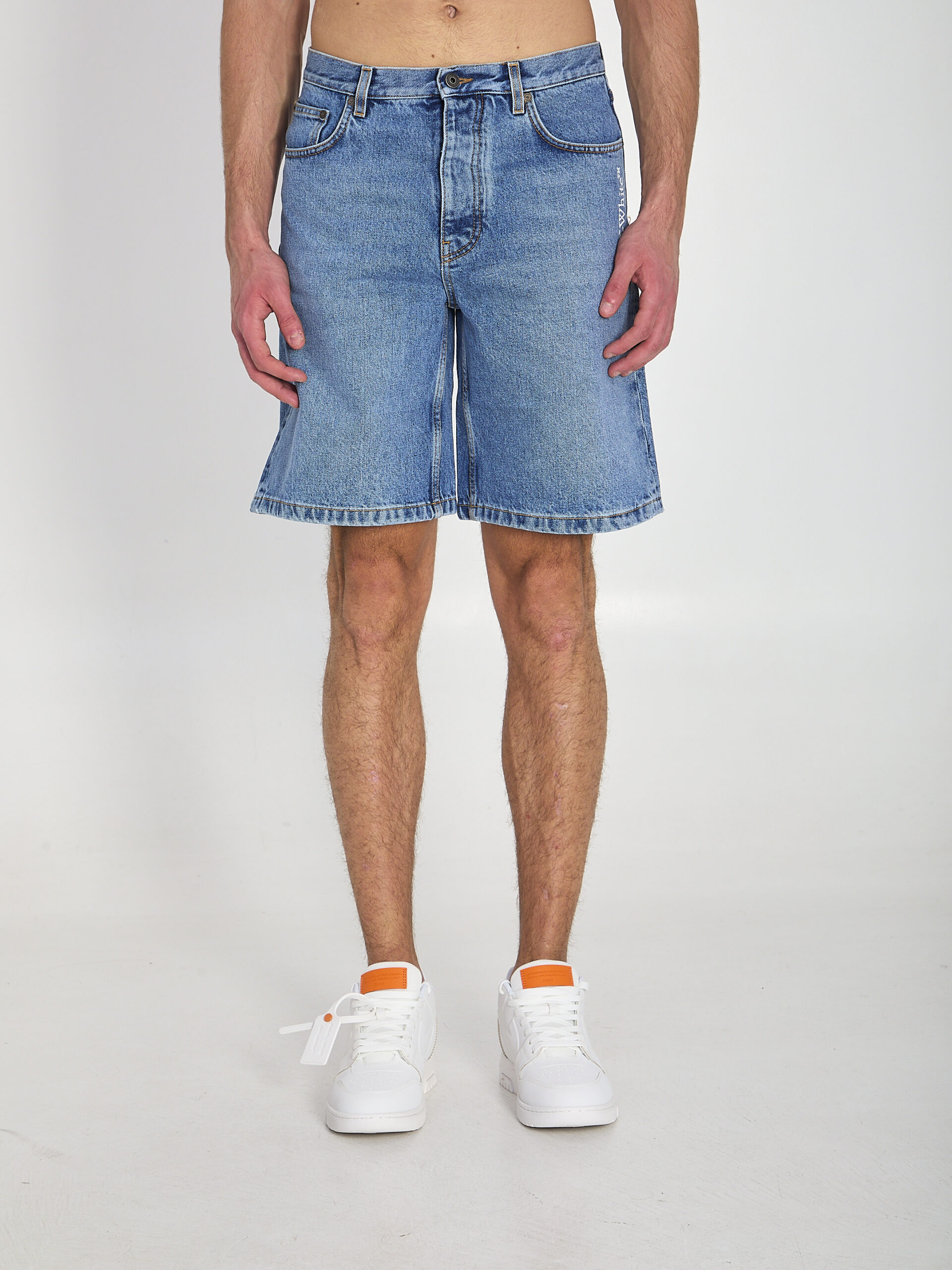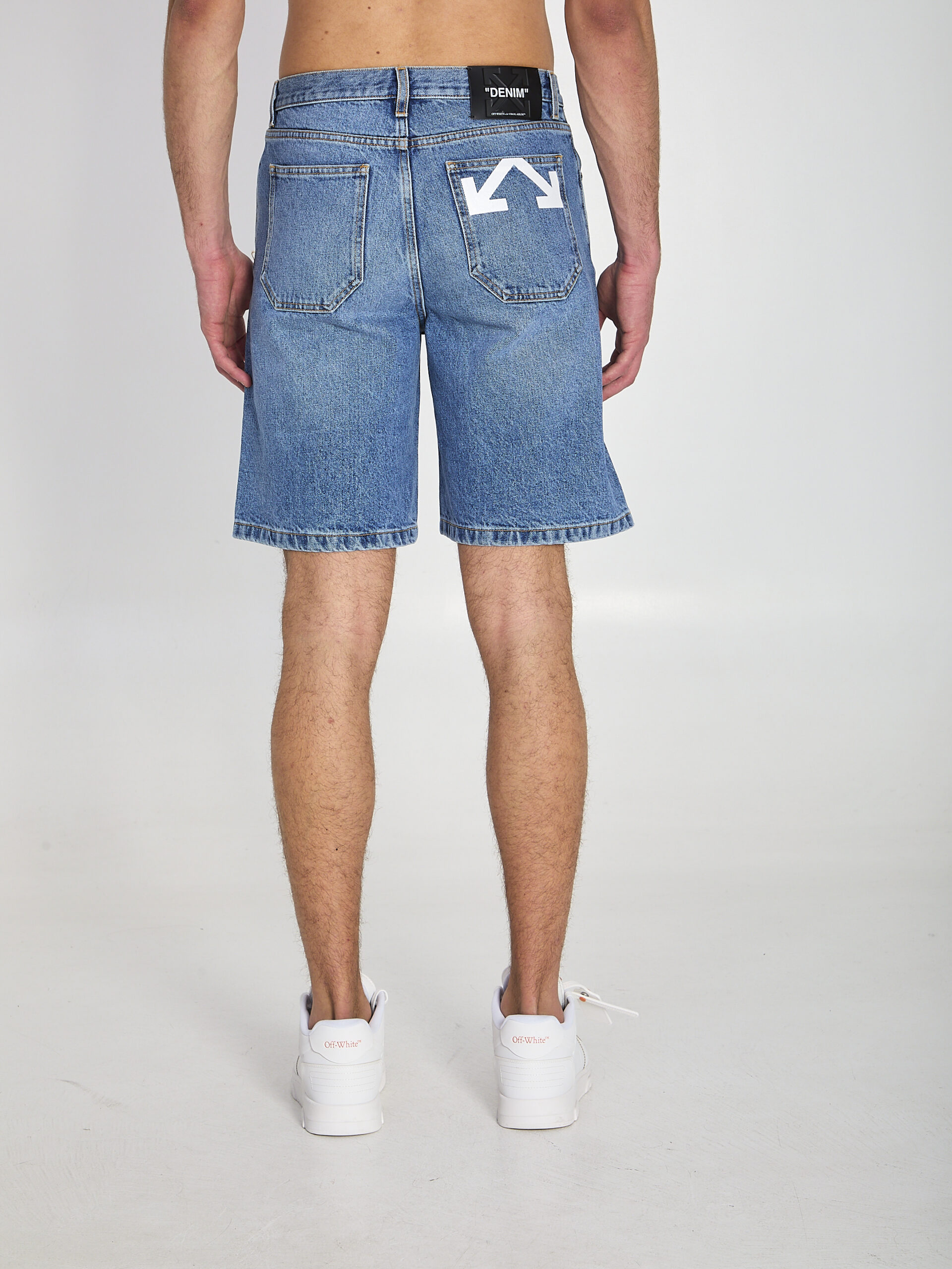 Blue cotton denim shorts. Feature belt loops, a front button closure, five pockets, a white Off-White signature on the side, a white Half Arrows print on the back, a black logo patch at the back waist, a mid-rise waist, and a wide leg. Regular fit.