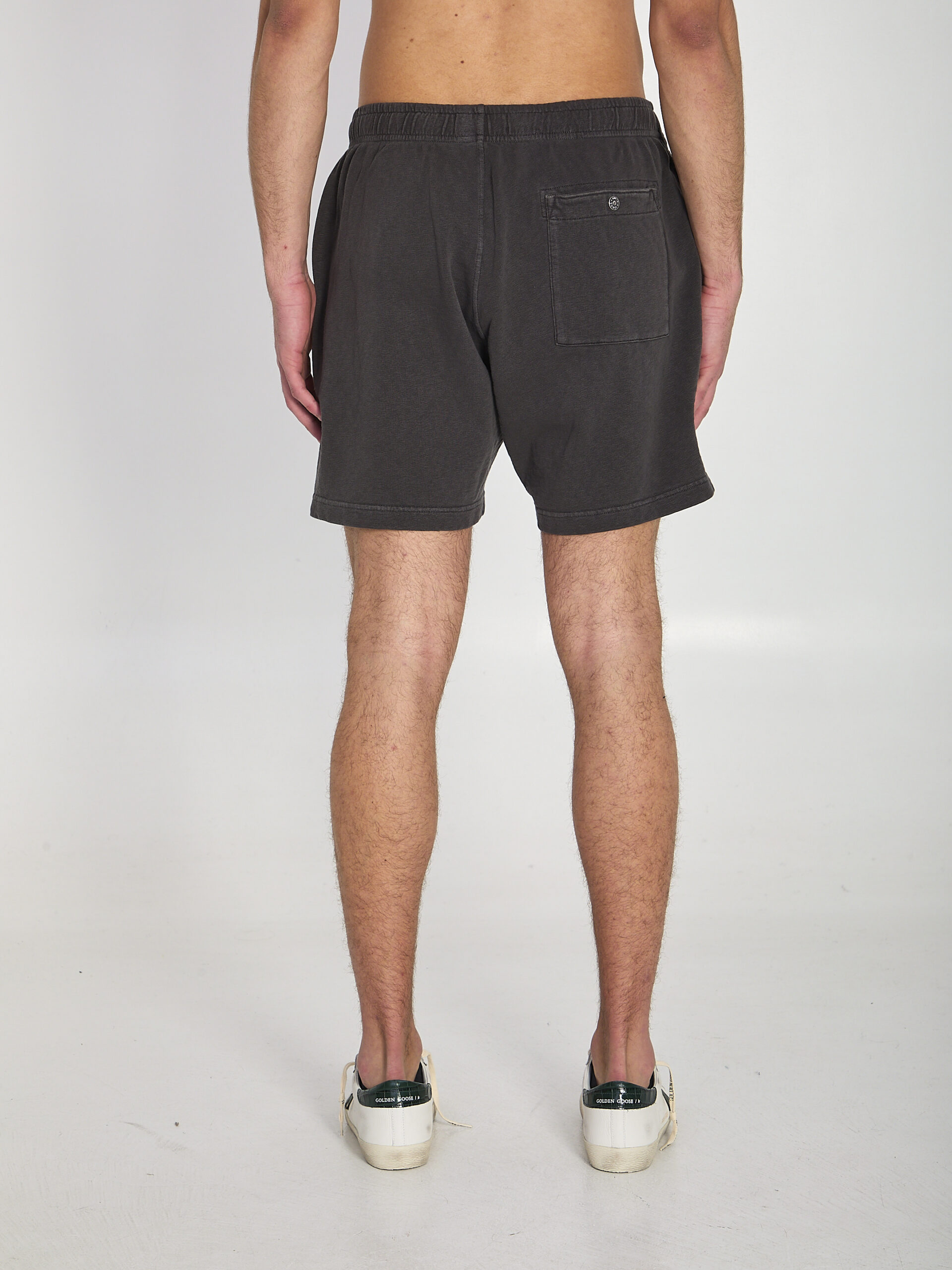 Charcoal grey fleece-lined cotton shorts. They feature an elasticated waist with an internal drawstring, two side pockets, a buttoned back pocket, an iconic badge appliquéd on the side, a low-rise waist, and a wide leg. Regular fit.
