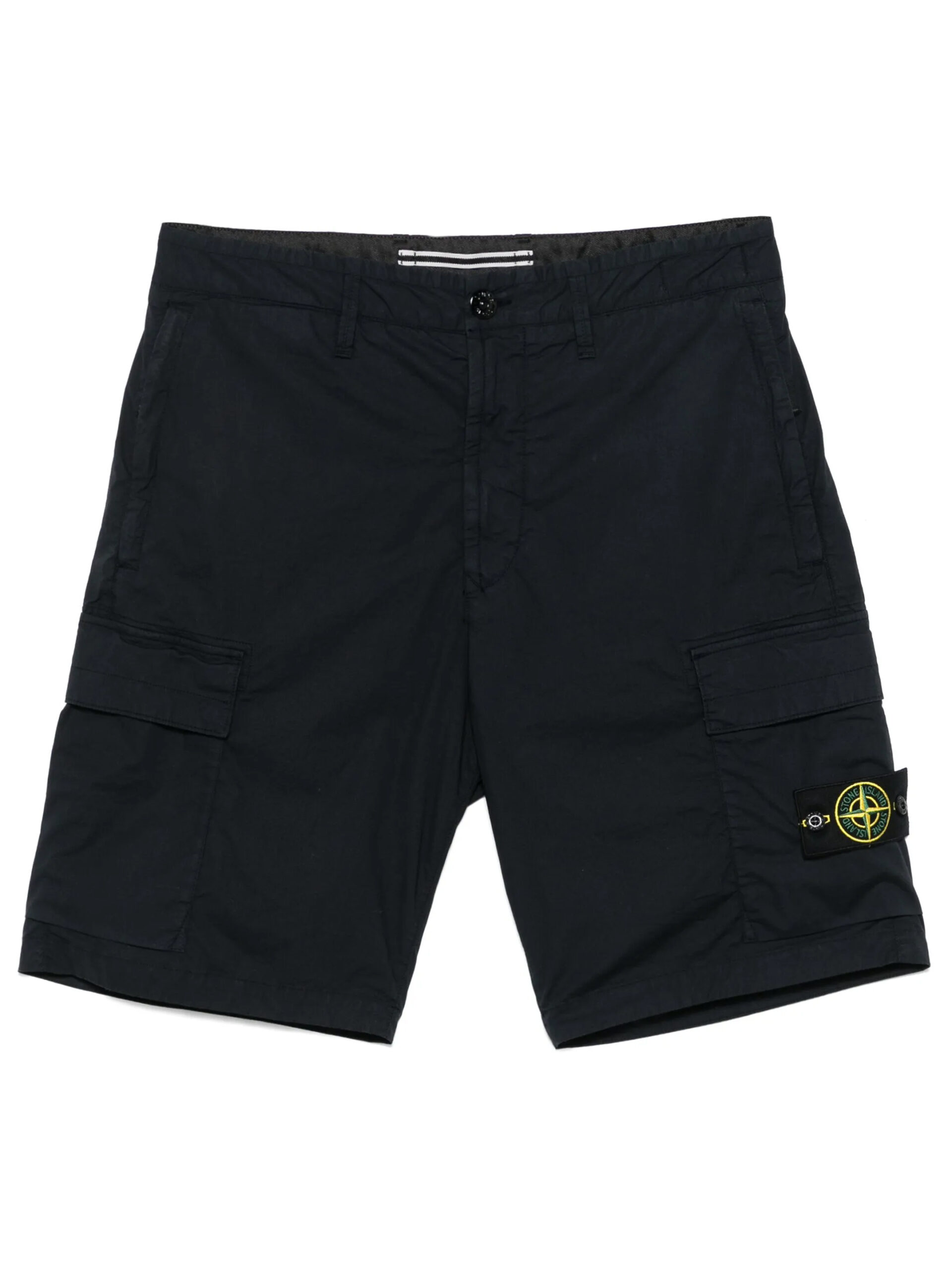 Lightweight stretch cotton navy blue bermuda shorts. Features belt loops, front button and zip closure, two side welt pockets, two side cargo pockets with flaps and buttons, iconic badge on the pocket, and a welt pocket with button at the back. Regular fit.