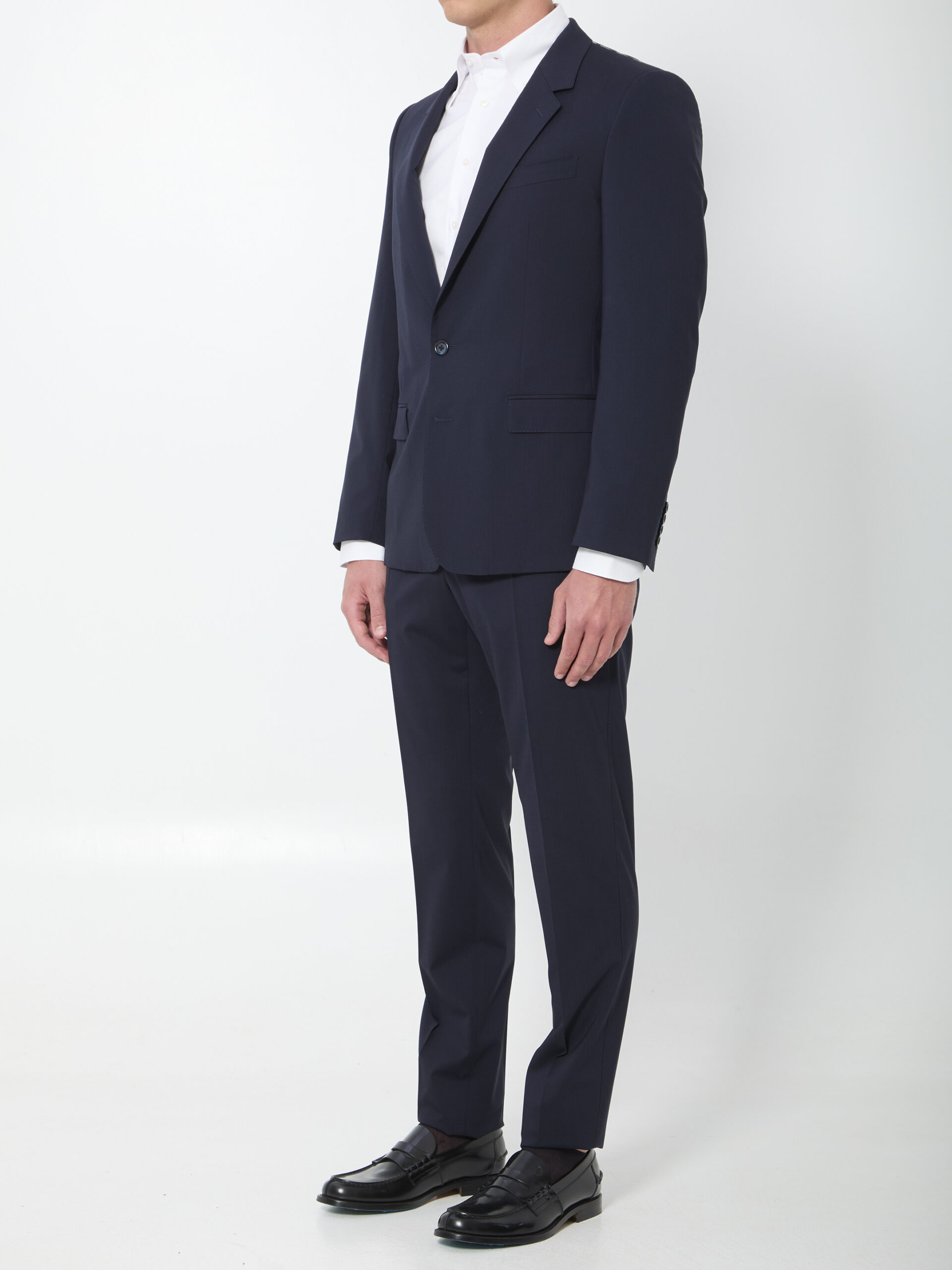 Single-breasted two-button jacket, classic lapels, two front flap pockets and one welt chest pocket, long sleeves, buttoned cuffs, single center back vent, viscose lining.