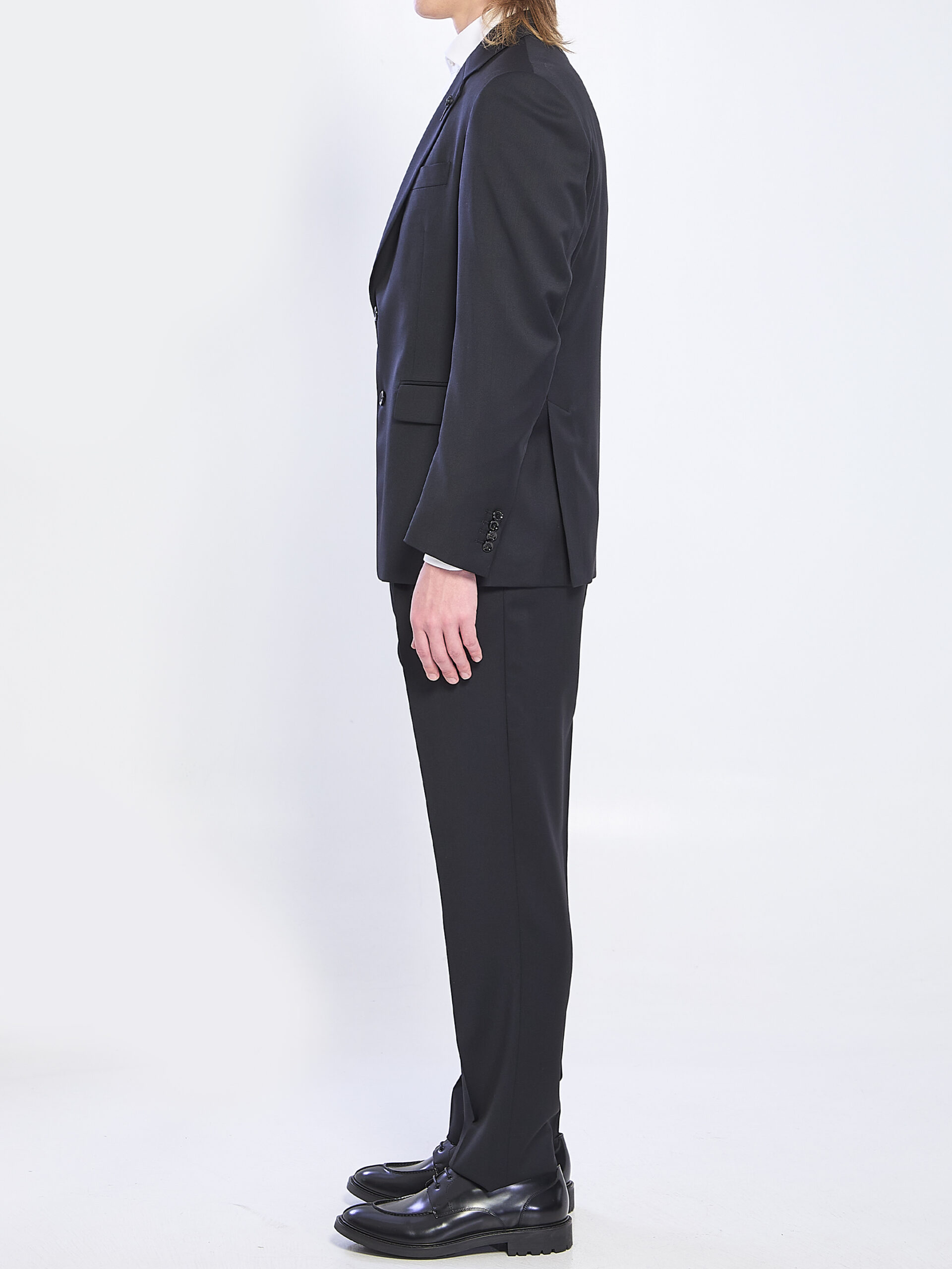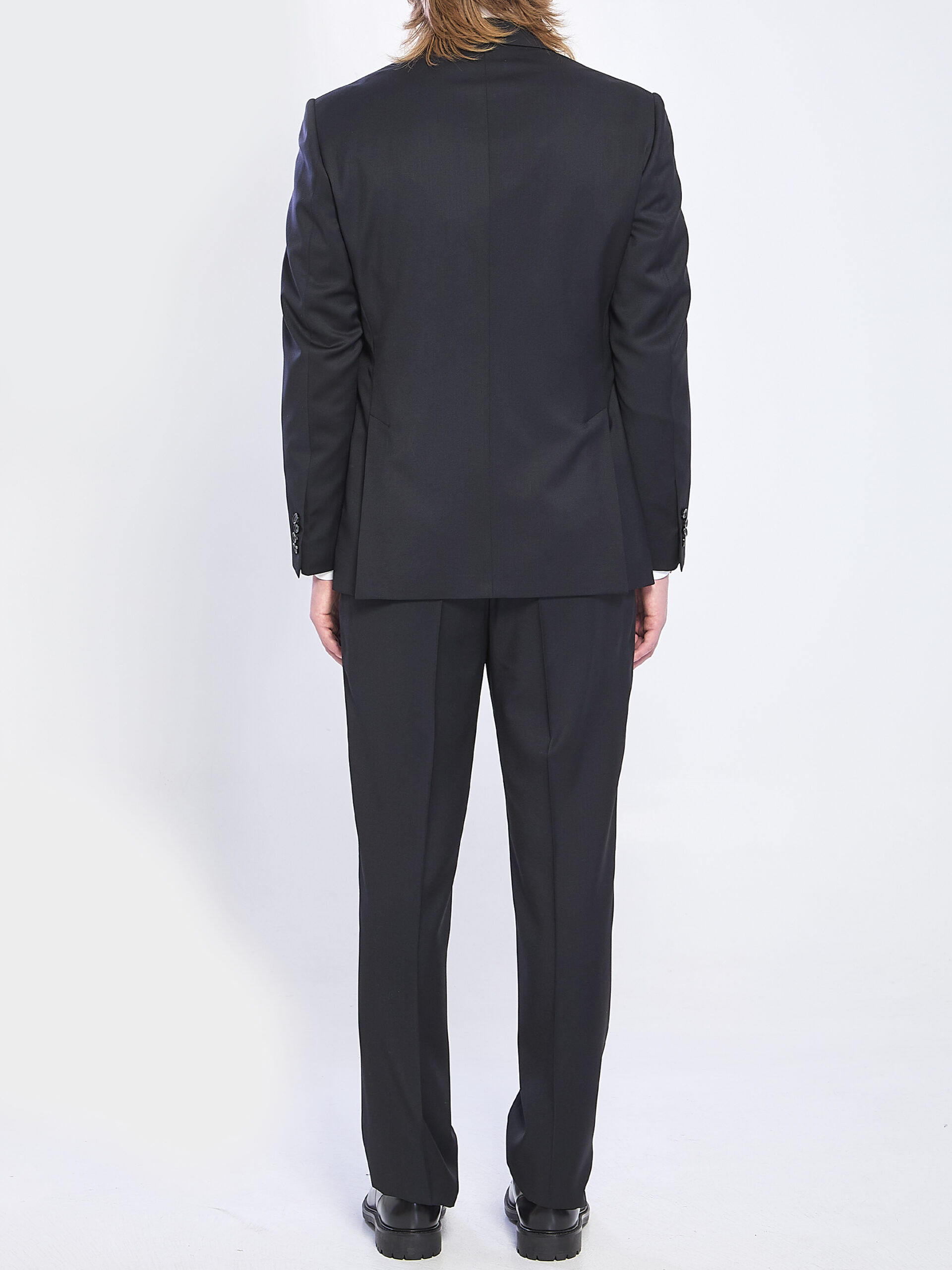 Feeling single-breasted suit in pure virgin wool twill in black. Single-breasted jacket with classic lapels and a lapel pin, front closure with buttons, two front pockets with flaps, a breast pocket with piping, buttoned cuffs, two back vents, two inner flat pockets, viscose and cupro lining. Straight-leg trousers with belt loops, pleats at the waist, closure with zip, button, and hook, two side pockets, two welt pockets with button on the back, pressed creases on the front and back, mid-rise waist. Classic fit.