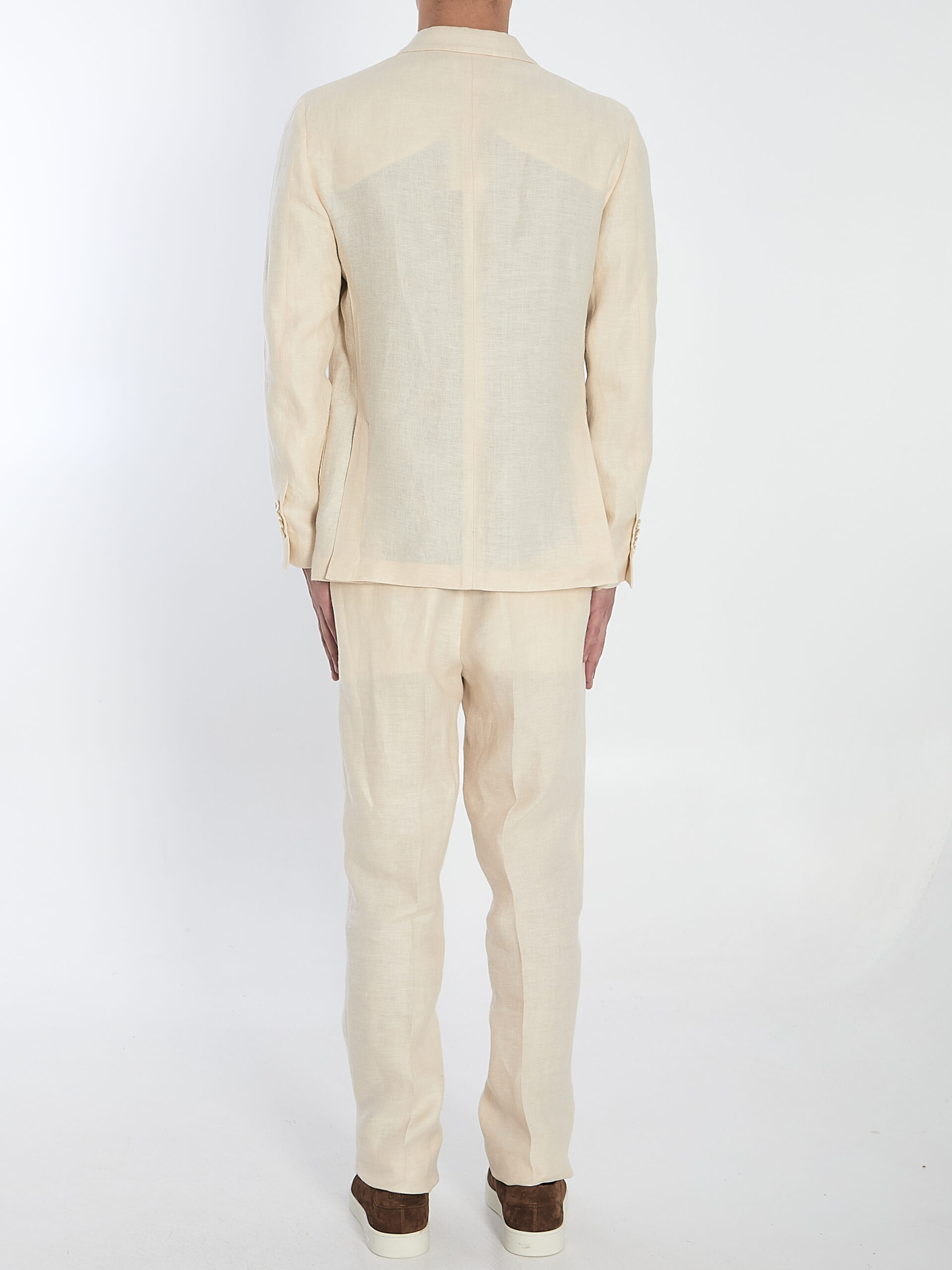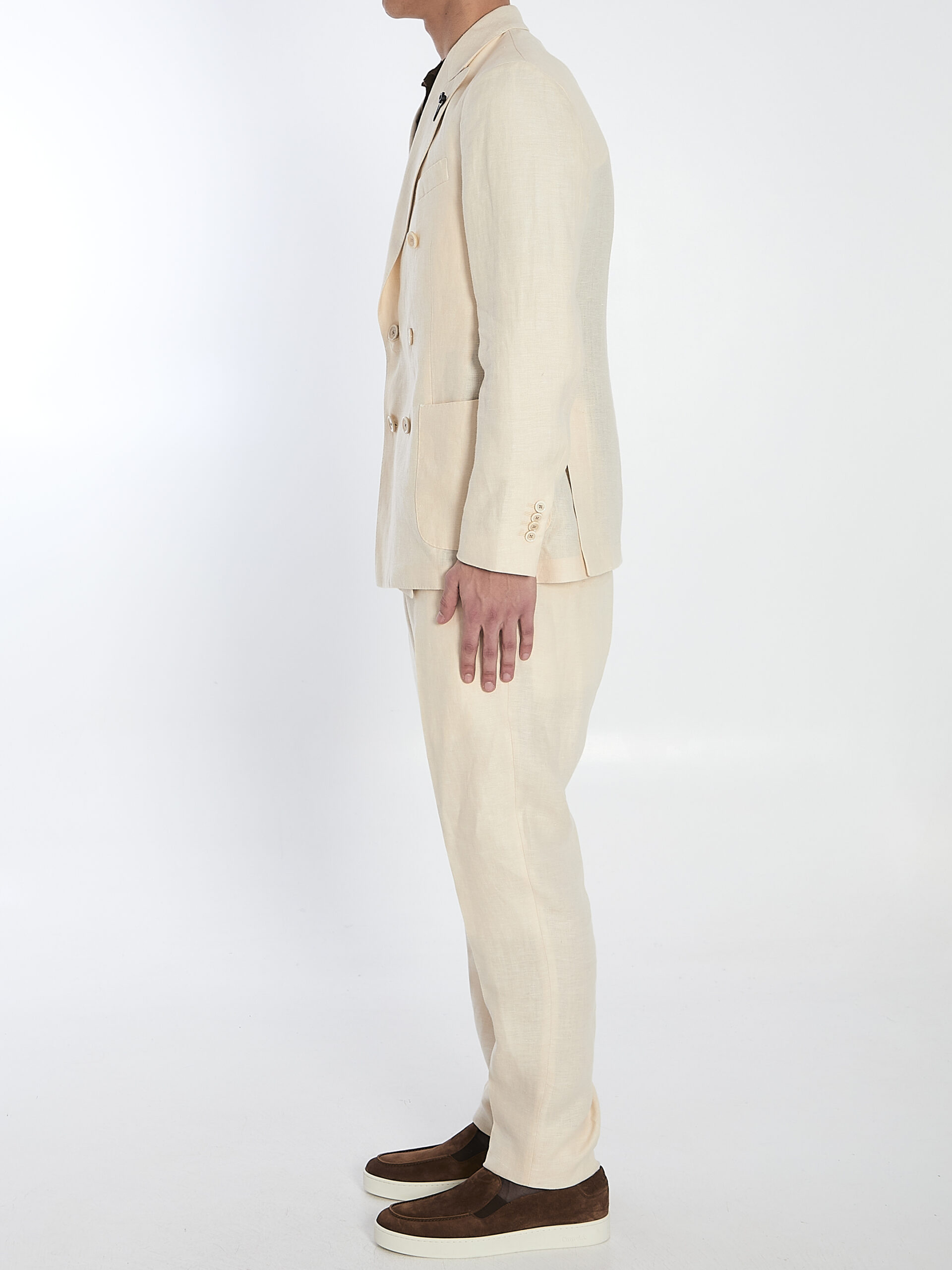 Two-piece suit in cream-colored linen. The double-breasted jacket features peak lapels with a lapel pin, a front button closure, a welt chest pocket, two front patch pockets, buttoned cuffs, one internal welt pocket, one internal buttoned pocket, and two back vents. The straight-leg trousers feature a double-button and zip closure, belt loops, two side pockets, and two back welt pockets with buttons. Regular fit.